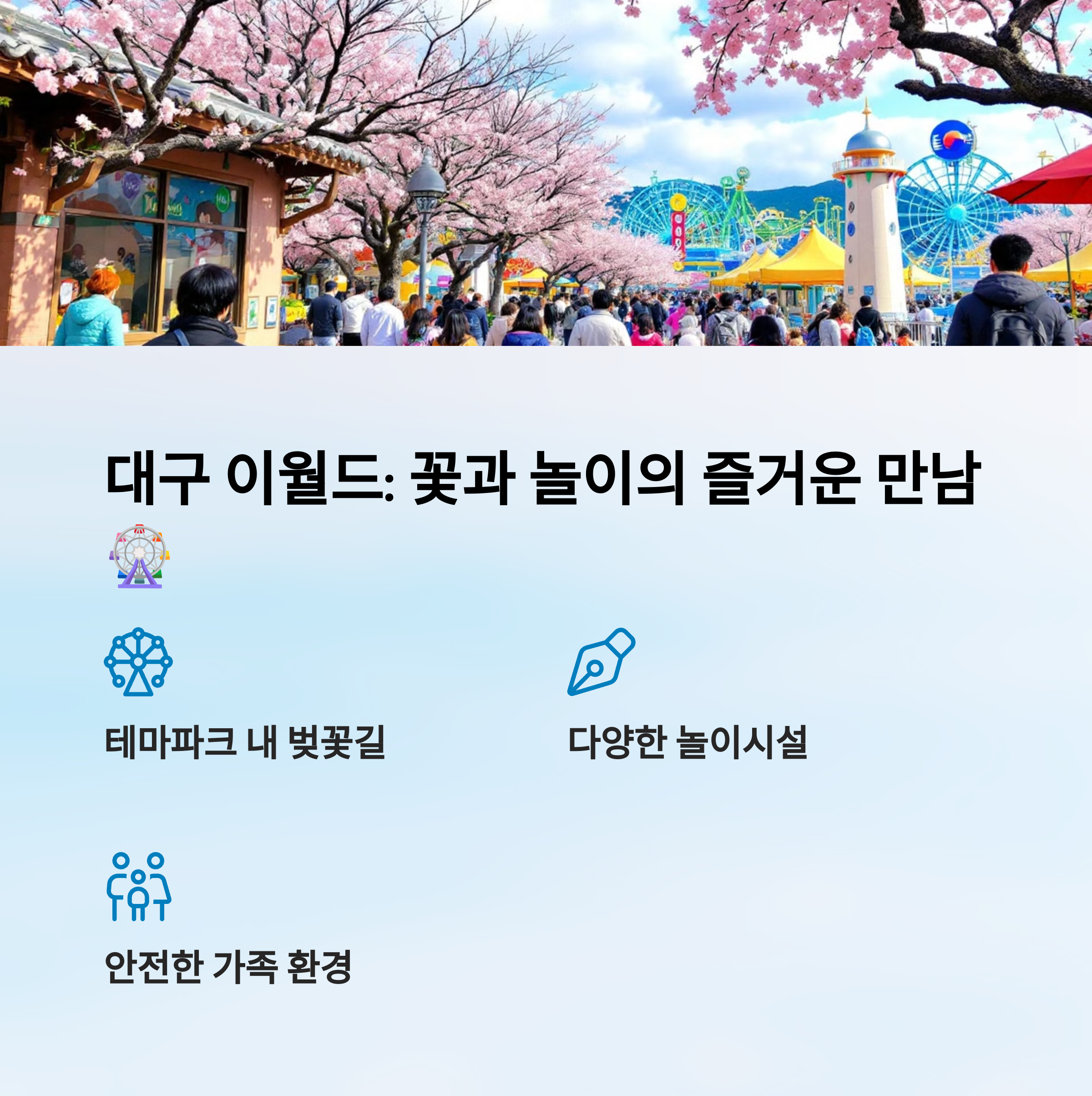 놀면서 걷는 즐거움을 주고 싶다면 이월드는 최적의 벚꽃 스폿이에요. 놀이기구를 타지 않더라도 벚꽃만으로도 충분히 만족스러울 수 있는 공간이죠🎠