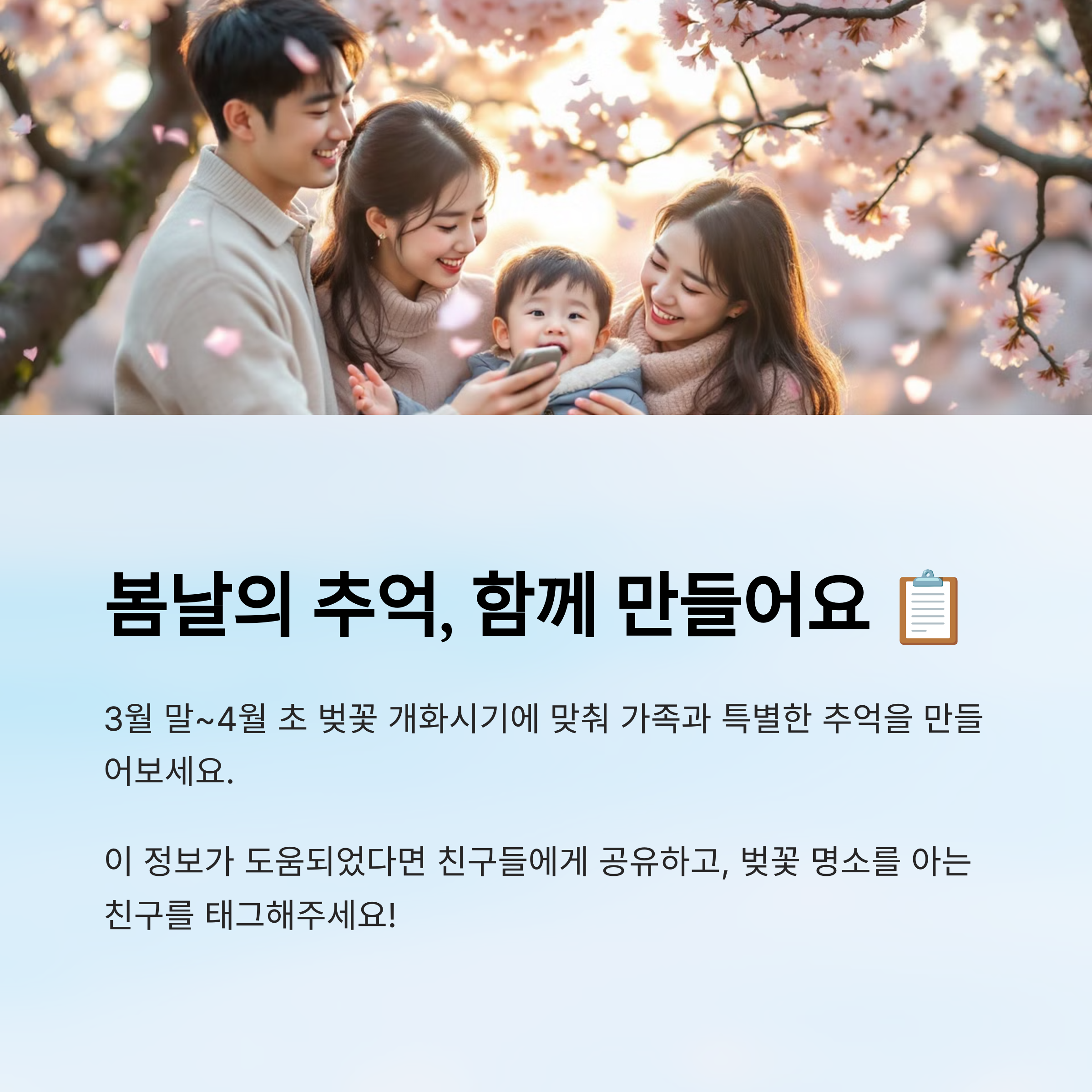 네 번째는 ‘사진 많이 찍기’예요! 아이가 걷는 모습, 벚꽃을 바라보는 표정, 가족 단체샷 등 소중한 순간들을 많이 남겨두세요. 봄날의 추억은 오래오래 간직할 수 있으니까요📷