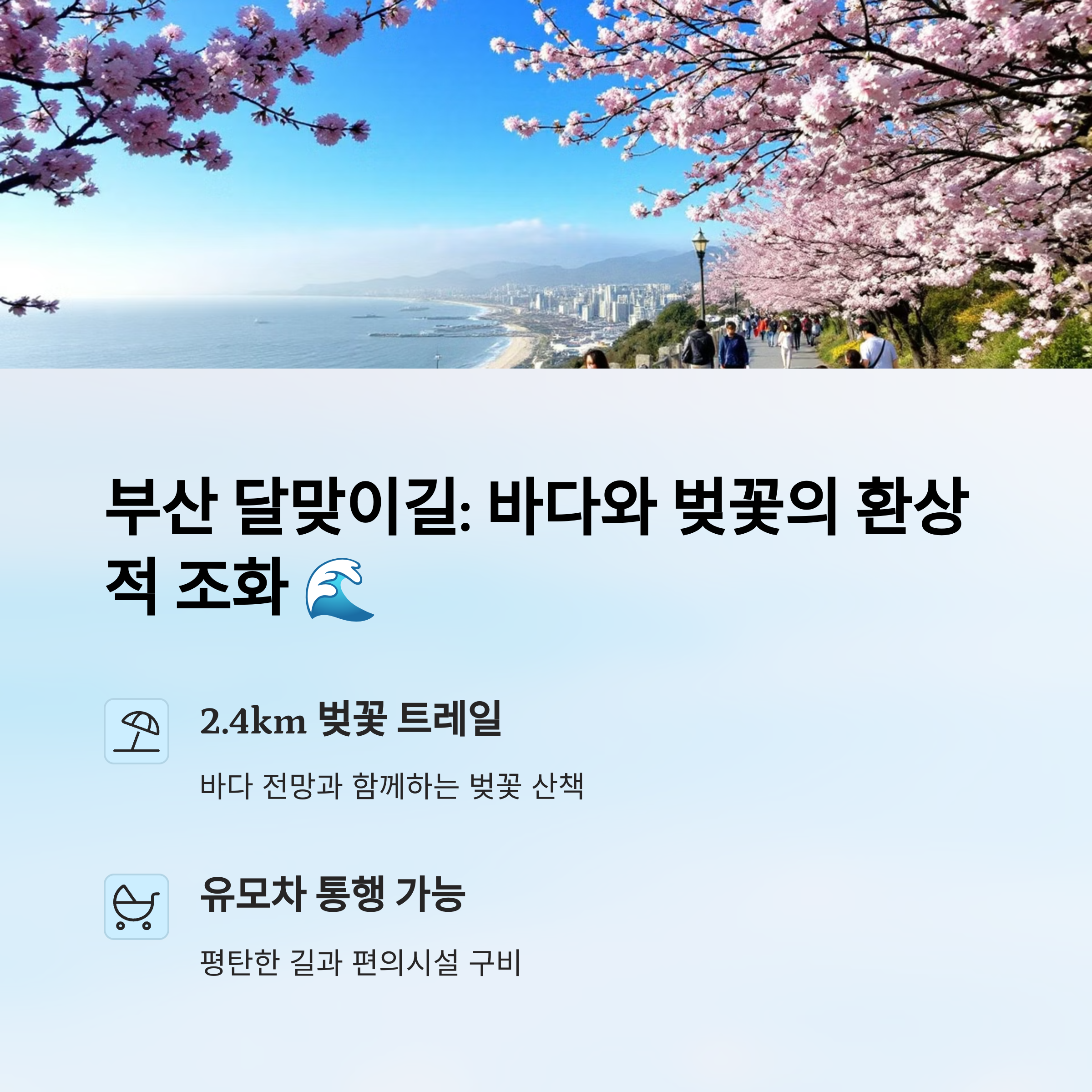 해운대와 송정 사이에 위치한 달맞이길은 바다와 벚꽃을 동시에 감상할 수 있는 환상적인 코스예요. 길이 완만하고 산책로가 잘 정리되어 있어서 아이와 함께 걷기에도 부담 없어요.