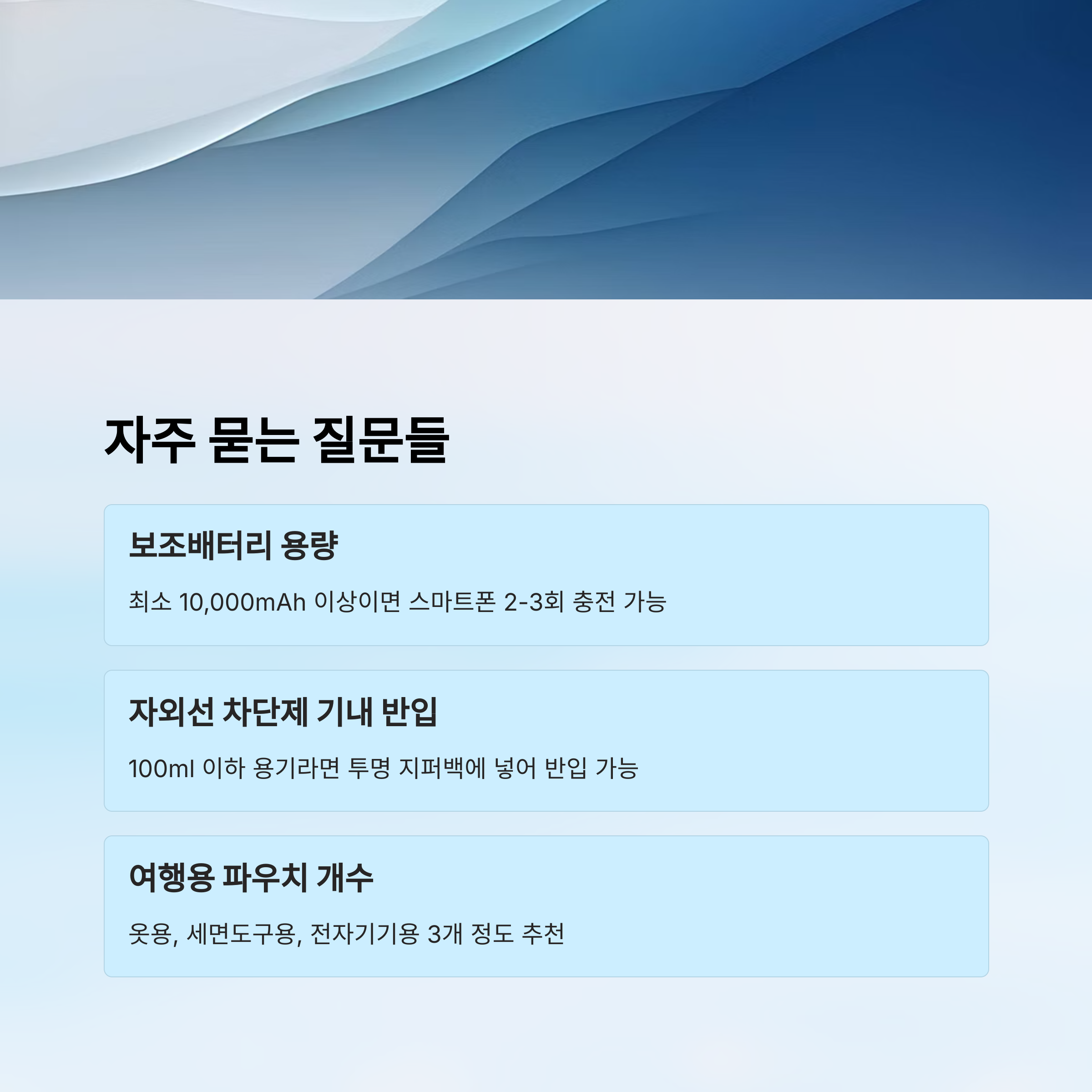 A1. 최소 10,000mAh 이상이면 스마트폰 2~3회 충전이 가능해서 여행 중 안심하고 사용할 수 있어요.