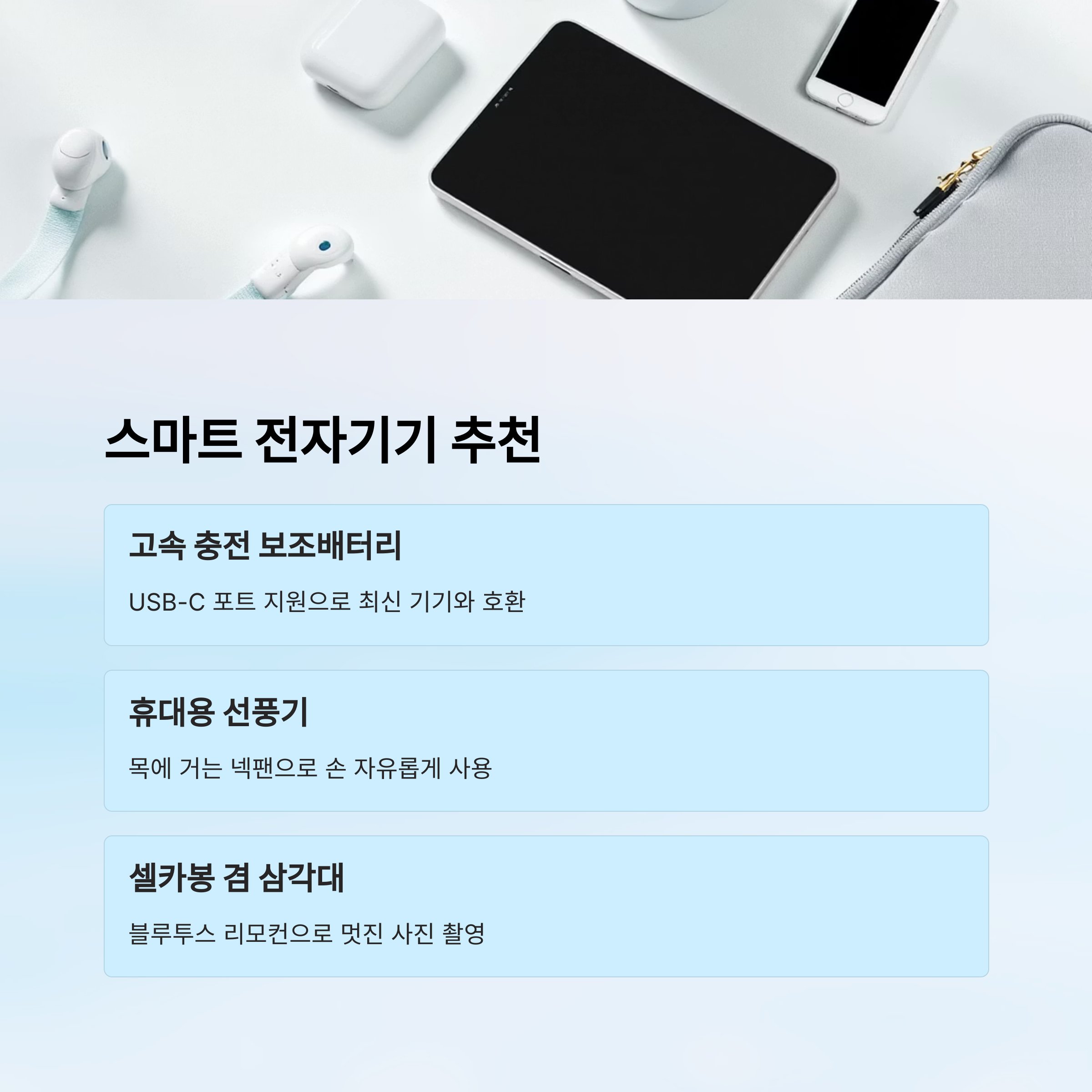 최근에는 여행용 아이템이 점점 똑똑해지고 있어요. 예를 들면 다기능 트래블 파우치, 방수 기능 있는 가방, 휴대용 미니 선풍기 등이 있죠. 이런 스마트한 제품들을 활용하면 여행이 훨씬 더 쾌적하고 즐거워진답니다. 😊