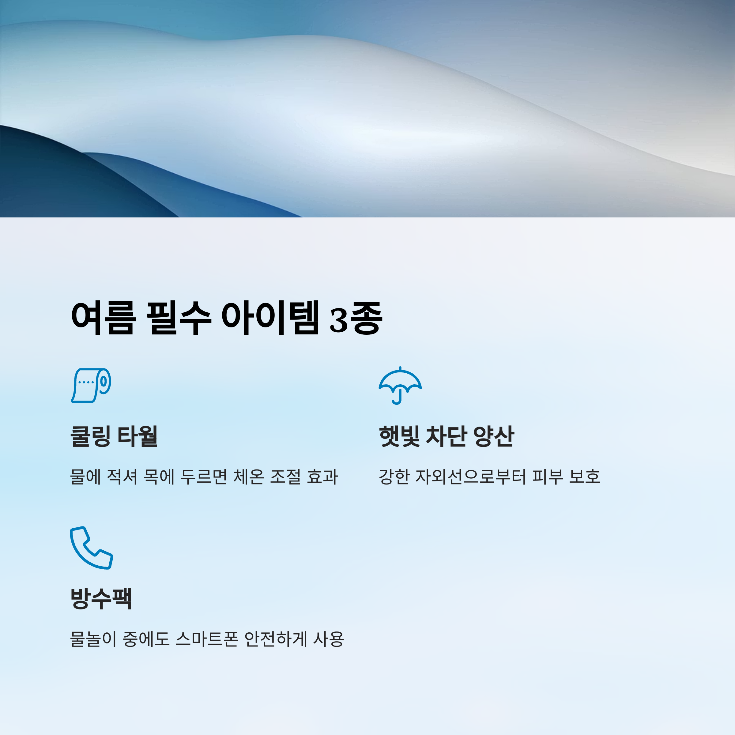 이 외에도 여름철에 유용한 아이템으로는 쿨링 바디미스트, 선크림 스틱, 땀 흡수 티슈 등이 있어요. 모두 작고 가볍지만 여름을 더욱 상쾌하게 만들어주는 도구들이에요!