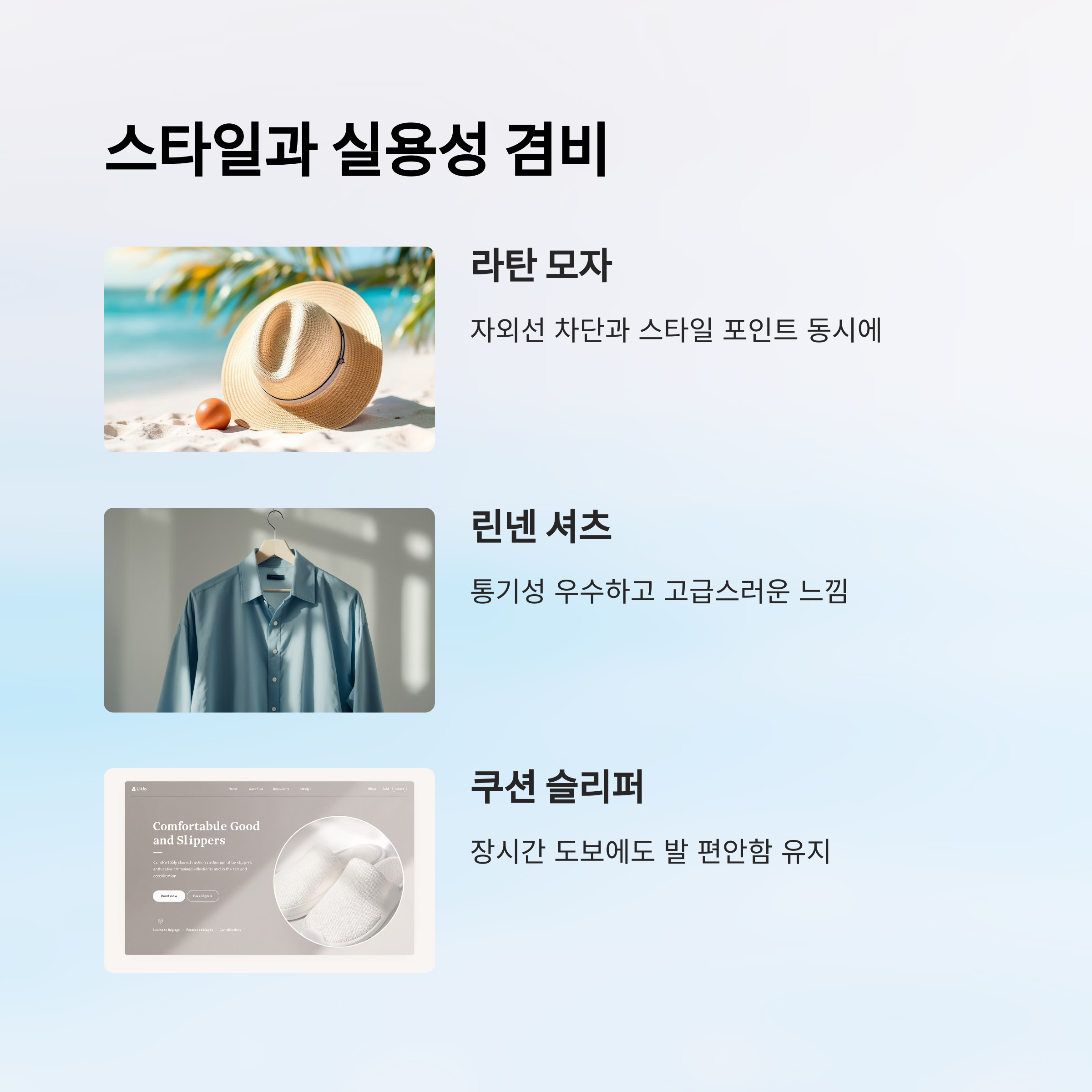 여름 여행이라면 멋도 챙기고, 편안함도 함께 누려야 하잖아요? 불편한 옷이나 무거운 신발은 여행의 피로도를 확 높여버릴 수 있어요. 그래서 스타일을 살리면서도 실용적인 여름 패션 아이템을 추천할게요. 🧢👡