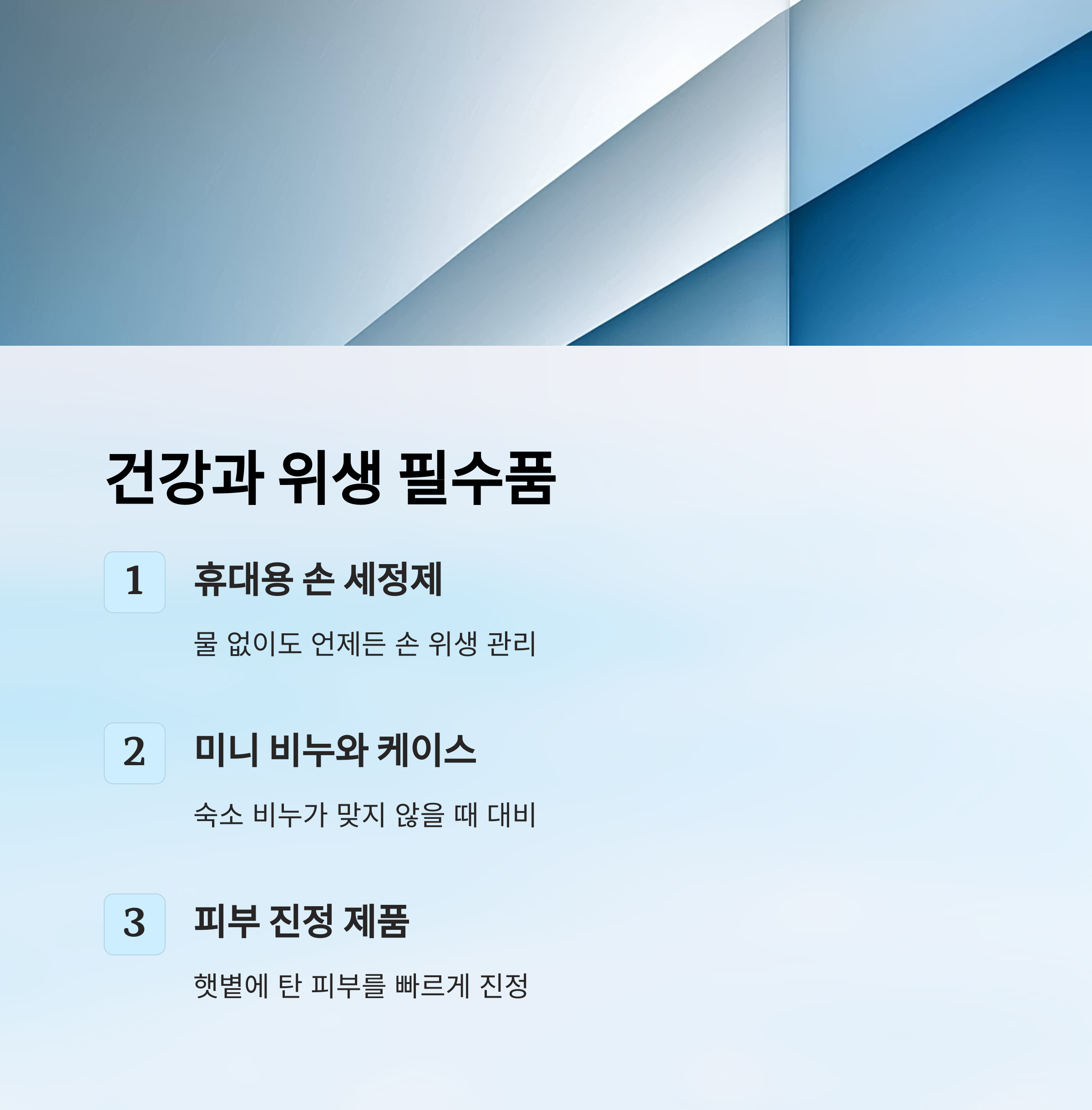 이 외에도 챙기면 좋은 위생용품으로는 여성용 위생용품, 면봉, 여행용 칫솔세트, 가글 등이 있어요. 작은 차이가 큰 차이를 만드는 게 여행이니까요. 위생을 챙기면 마음도 훨씬 편안해져요! 😊