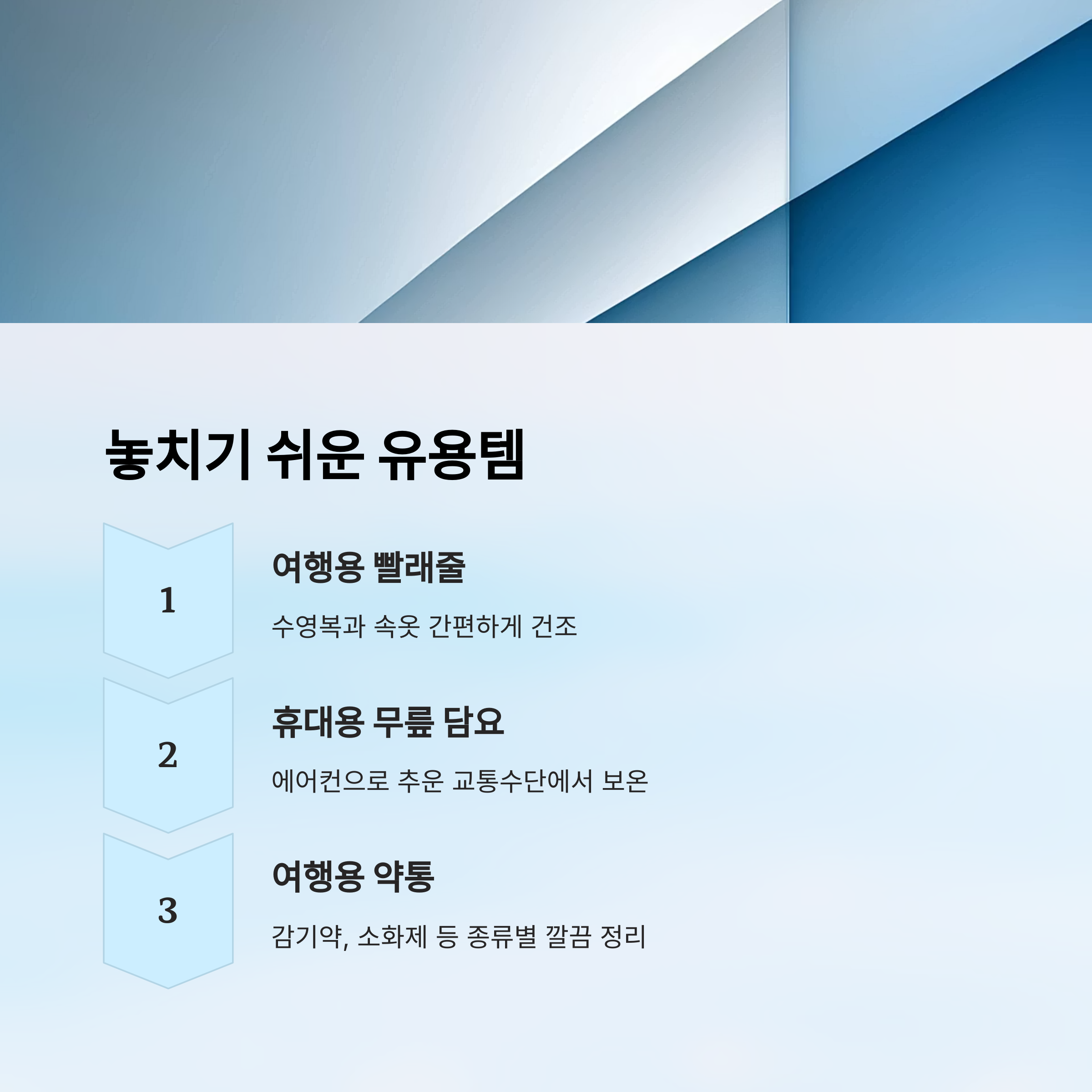 눈에 잘 띄진 않지만 여행에서 정말 유용한 아이템들이 있어요. 자칫하면 준비하지 못하고 떠날 수 있는데, 막상 현지에 가면 '왜 안 챙겼을까' 하고 후회하게 되는 것들이죠. 오늘은 그런 놓치기 쉬운 꿀템들을 소개할게요. 🧠