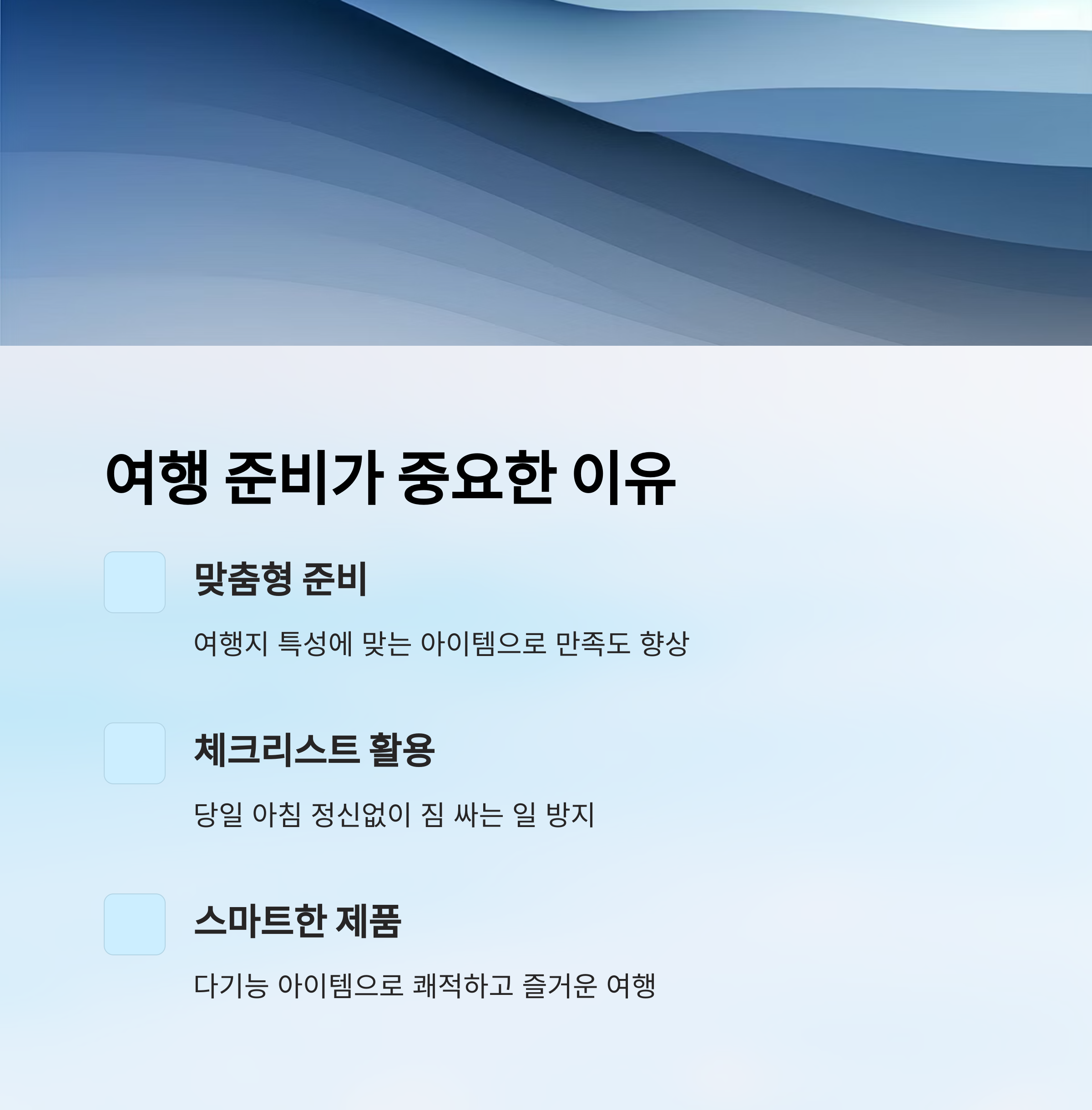 이렇게 리스트로 정리해서 하나씩 체크하면 깜빡할 걱정도 줄어들어요. 단순한 물건 하나지만, 여행의 쾌적함을 좌우할 수 있으니 꼼꼼히 준비해보세요!