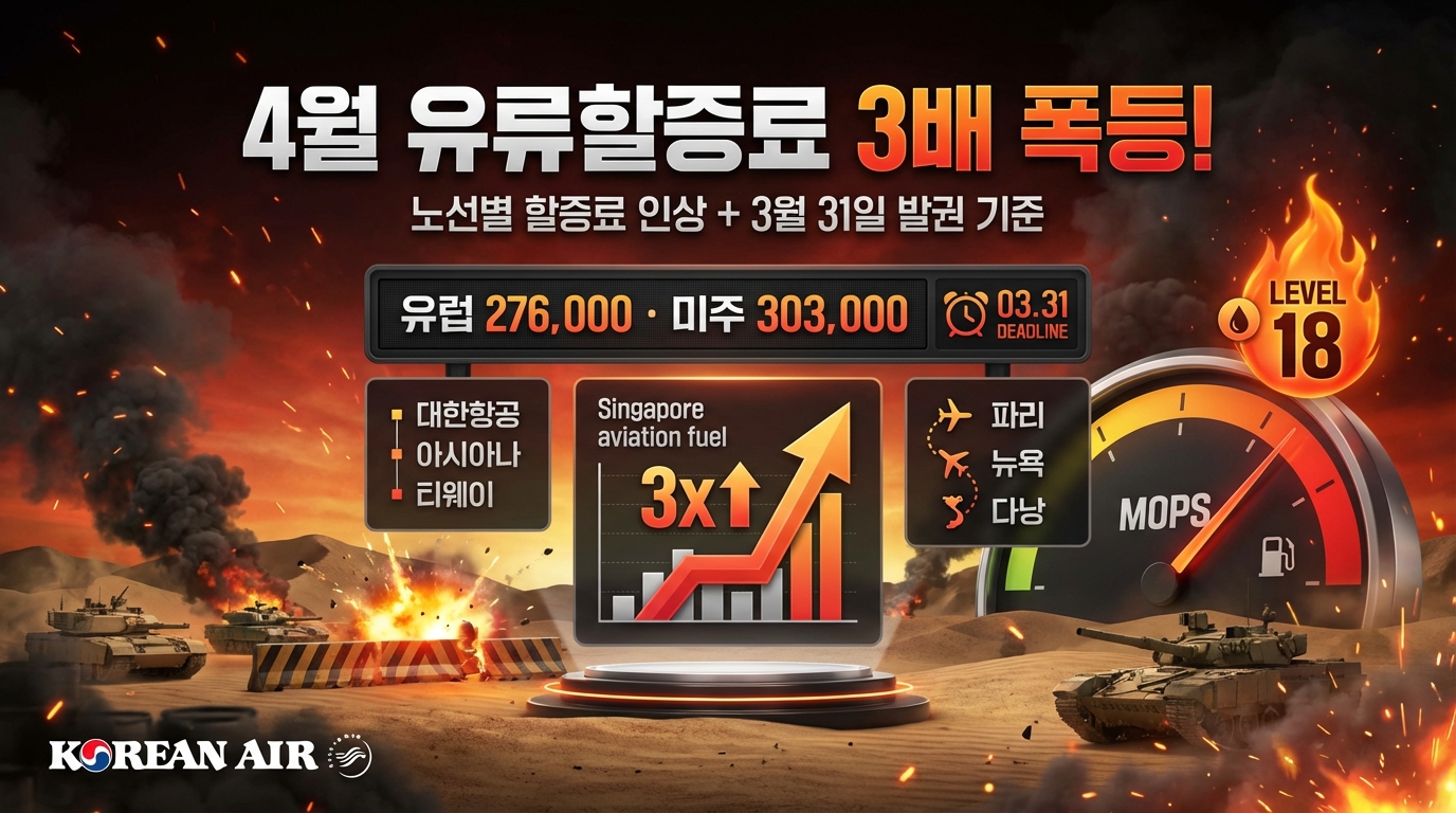유류할증료는 '탑승일'이 아닌 '발권일' 기준입니다. 즉, 여행을 5월이나 6월에 가더라도 3월 중에 결제를 완료하면 인상 전 가격을 적용받을 수 있습니다.
