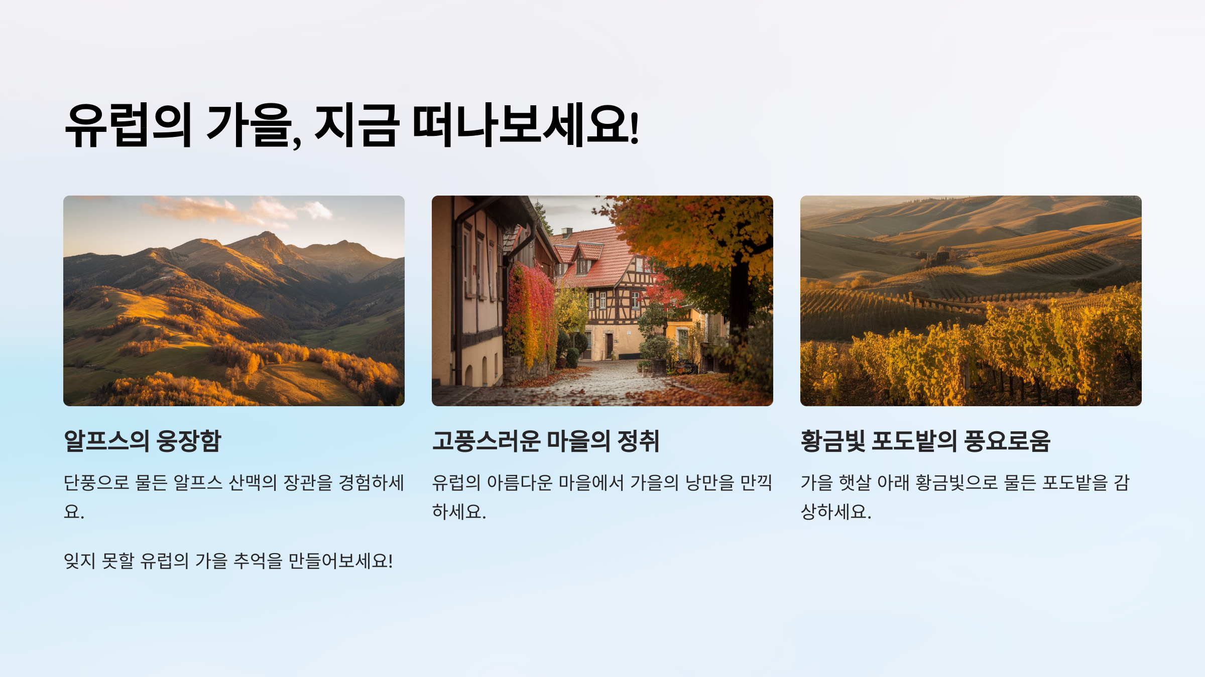 유럽의 가을은 다른 계절과는 또 다른 낭만과 매력을 가지고 있습니다. 알프스의 웅장한 산맥, 고풍스러운 마을, 황금빛 포도밭, 그리고 단풍이 어우러진 유럽의 가을 풍경은 평생 잊지 못할 추억을 선사할 것입니다. 이번 가을에는 유럽에서 자연과 역사가 만든 꿈 같은 여행을 떠나보세요. 😊🍁
