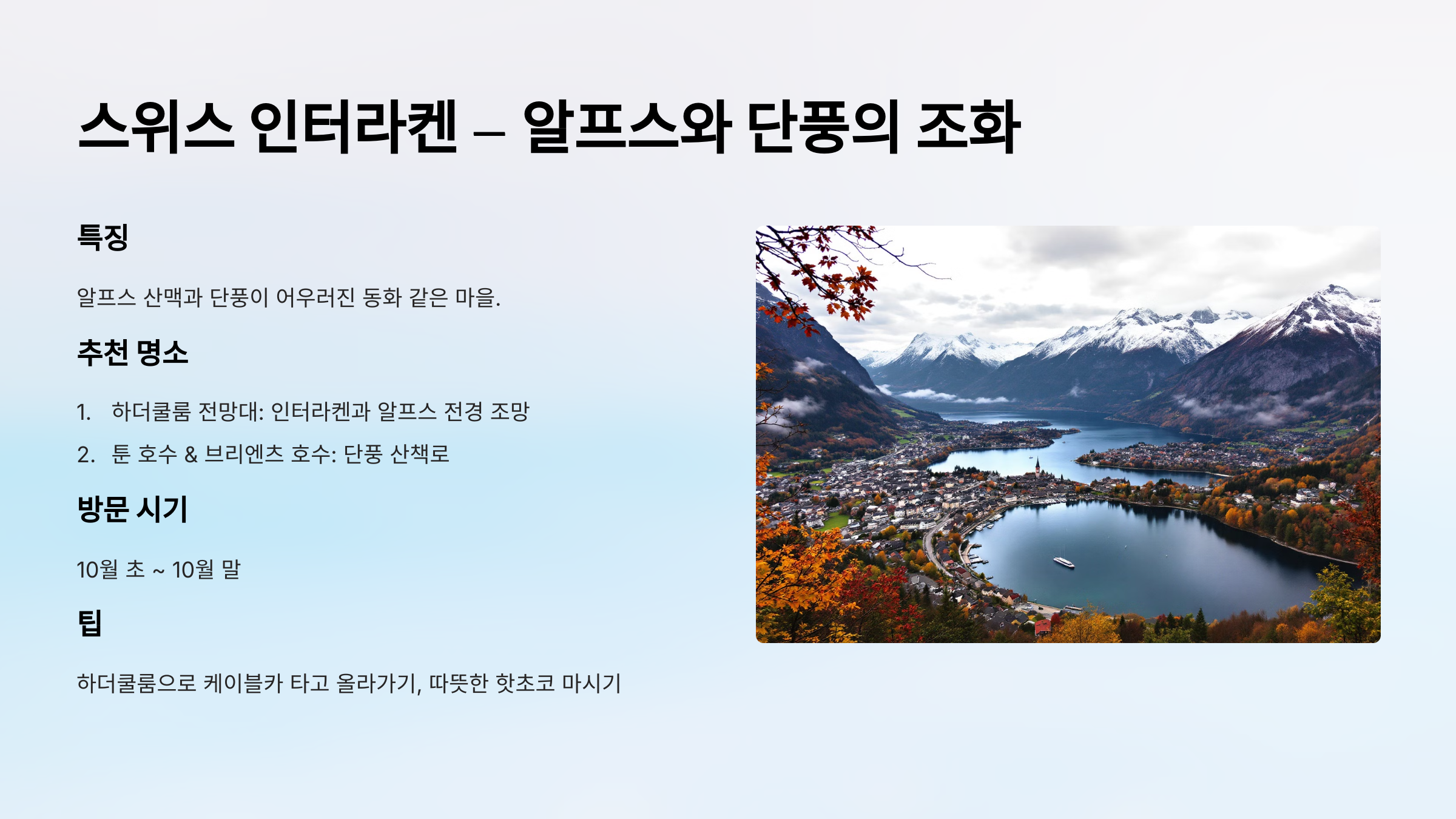 - 특징: 알프스 산맥의 웅장한 풍경과 단풍이 어우러진 인터라켄은 가을이면 동화 속 마을 같은 분위기를 선사합니다. 맑은 호수와 초록의 산, 그리고 황금빛 나무들이 만드는 풍경은 그야말로 장관입니다.