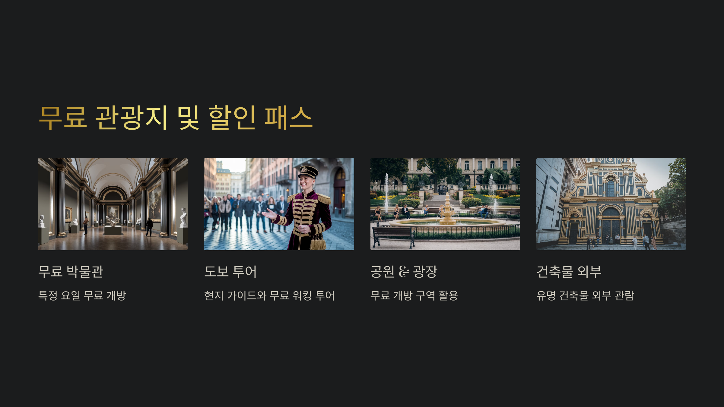 A5. 무료 박물관(대영박물관, 루브르 박물관 특정 요일), 도보 투어, 공원 산책, 유명 건축물 외부 관람 등을 활용하면 무료로 즐길 수 있어요.
