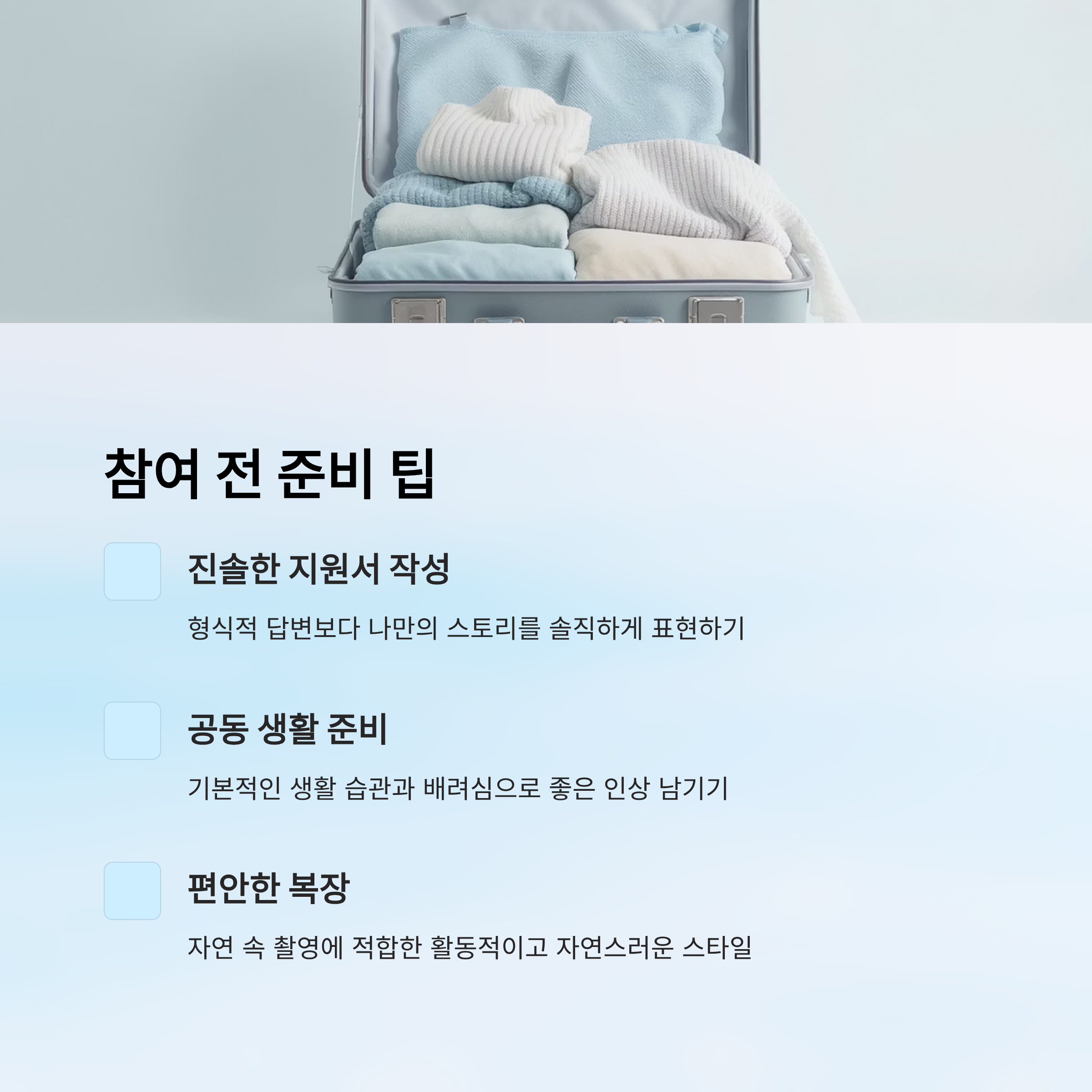 옷차림이나 짐 준비도 미리 고려해야 해요. 촬영은 주로 자연 속에서 이뤄지기 때문에 편안하고 활동적인 복장이 적합해요. 너무 화려한 의상보다는 자유롭고 자연스러운 스타일이 더 잘 어울리죠. 또한 개인 위생용품이나 일상에 꼭 필요한 물건은 챙기되, 캠프 규정상 제한되는 물품은 가져가지 않는 것이 좋아요.