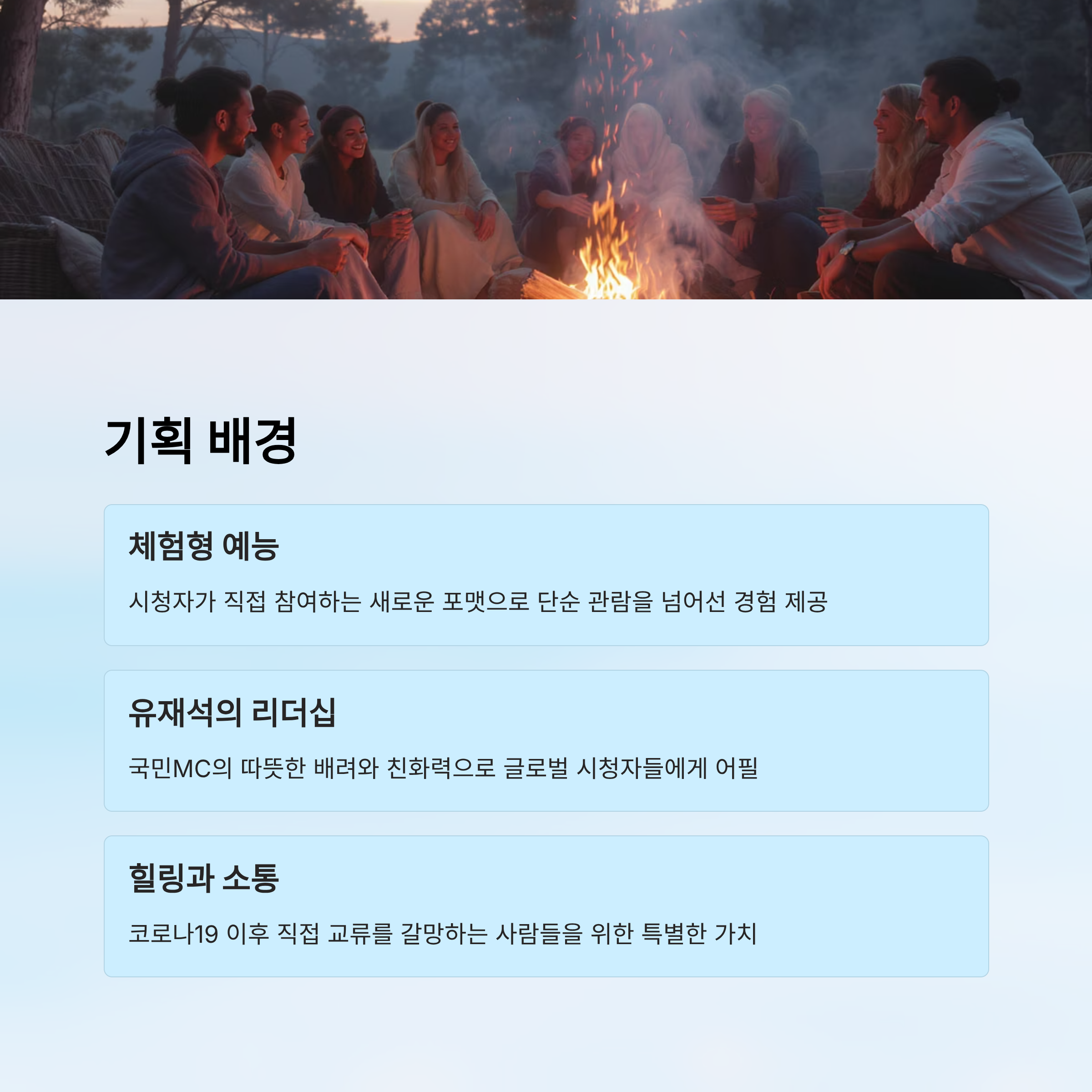 유재석 캠프가 만들어지게 된 배경에는 최근 변화하는 예능 트렌드가 큰 역할을 했어요. 기존의 단순한 웃음을 주는 예능에서 벗어나, 시청자들이 직접 참여할 수 있는 체험형 프로그램이 점점 주목받고 있기 때문이에요. 넷플릭스는 글로벌 플랫폼답게 시청자들이 단순한 관람자가 아니라 참여자로서 경험을 공유할 수 있는 새로운 포맷을 찾고 있었답니다.