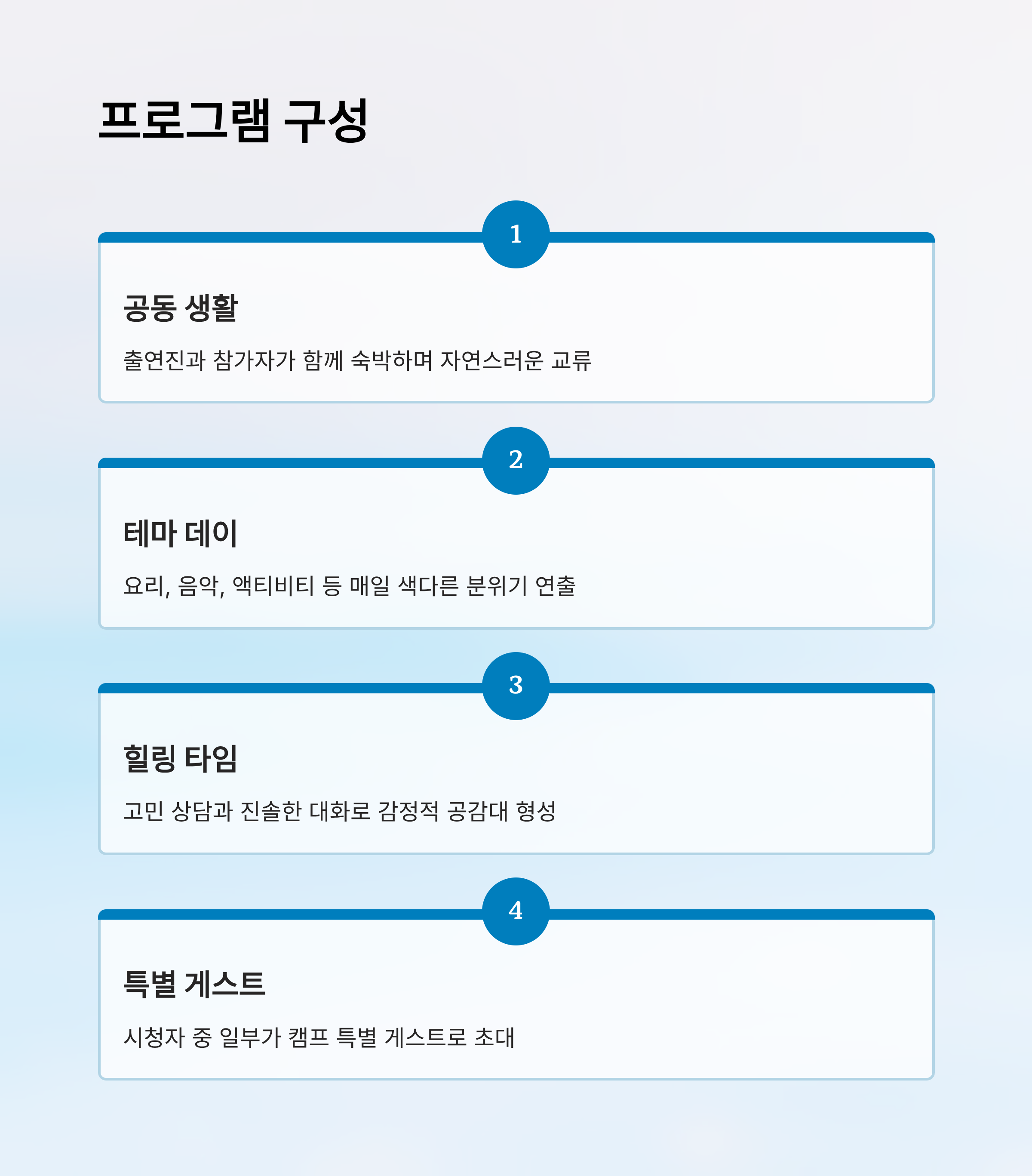 또한 제작진은 ‘힐링’과 ‘공감’을 중요한 키워드로 삼고 있어요. 따라서 프로그램은 단순히 시끄럽게 떠드는 예능이 아니라, 캠프에 참여한 사람들이 진솔한 이야기를 나누고 서로 위로하는 장면들을 중심에 두고 있죠. 이러한 구성이 다른 예능과 차별되는 포인트예요.