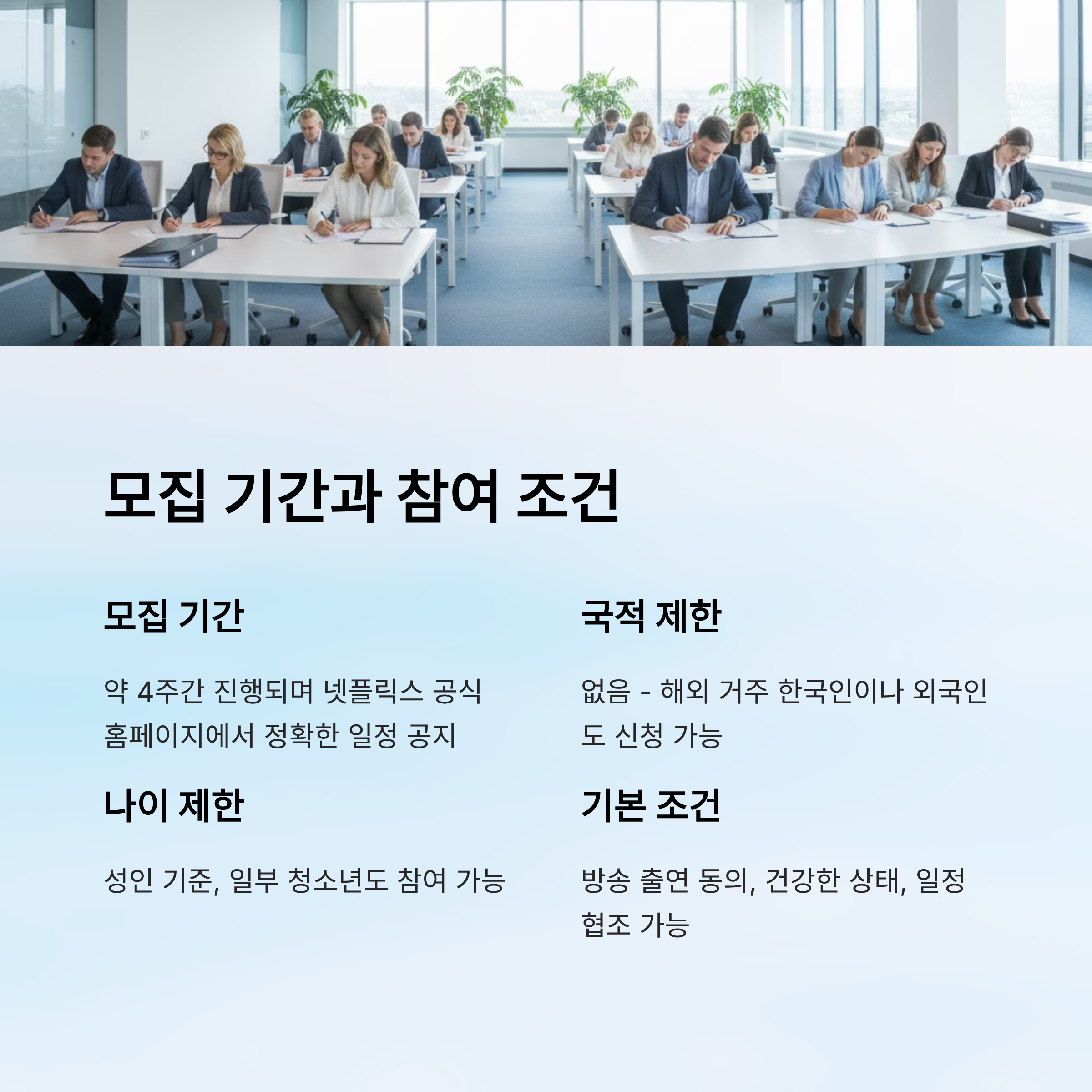 👉 본 글은 정보 제공을 위한 참고용이며, 실제 모집 및 출연 조건은 넷플릭스와 제작진 공지에 따라 달라질 수 있어요.