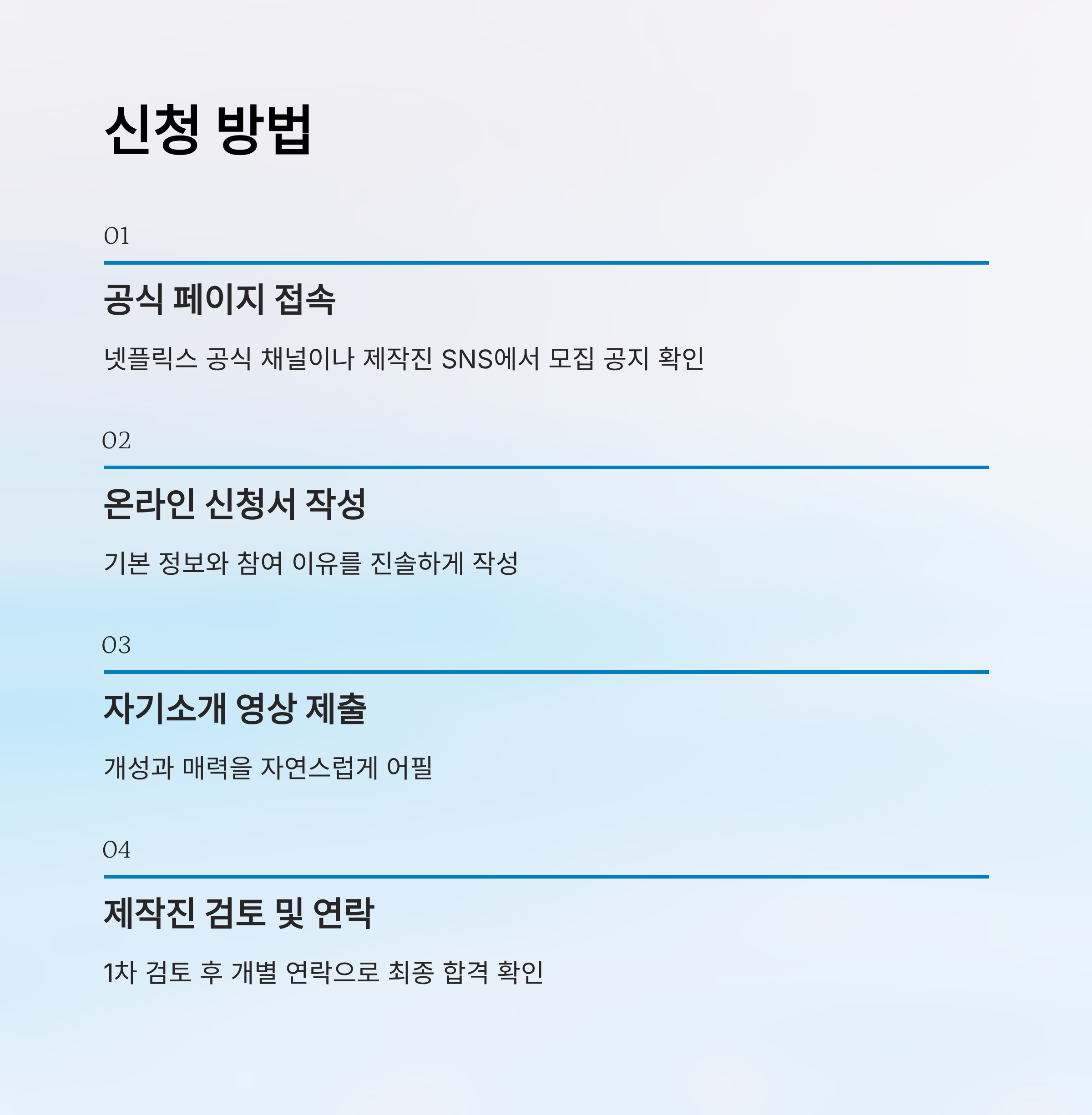 신청 절차를 정리하자면, 공식 페이지 접속 → 온라인 신청서 작성 → 자기소개 및 영상 제출 → 제작진 1차 검토 → 개별 연락 순서로 이어져요. 모든 과정이 온라인으로 진행되기 때문에 해외에 거주하는 사람도 참여 기회가 열려 있다는 점이 특징이에요. 이런 개방적인 방식은 넷플릭스 글로벌 예능다운 선택이라고 볼 수 있죠.
