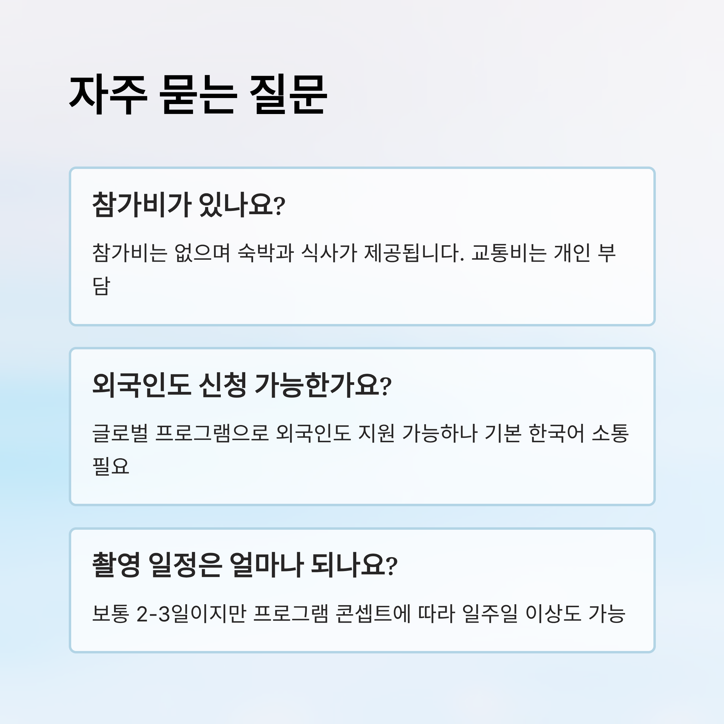 A1. 기본적으로 만 19세 이상 성인이면 누구나 신청할 수 있어요. 다만 제작진이 요구하는 간단한 조건이나 일정에 따라 달라질 수 있어요.