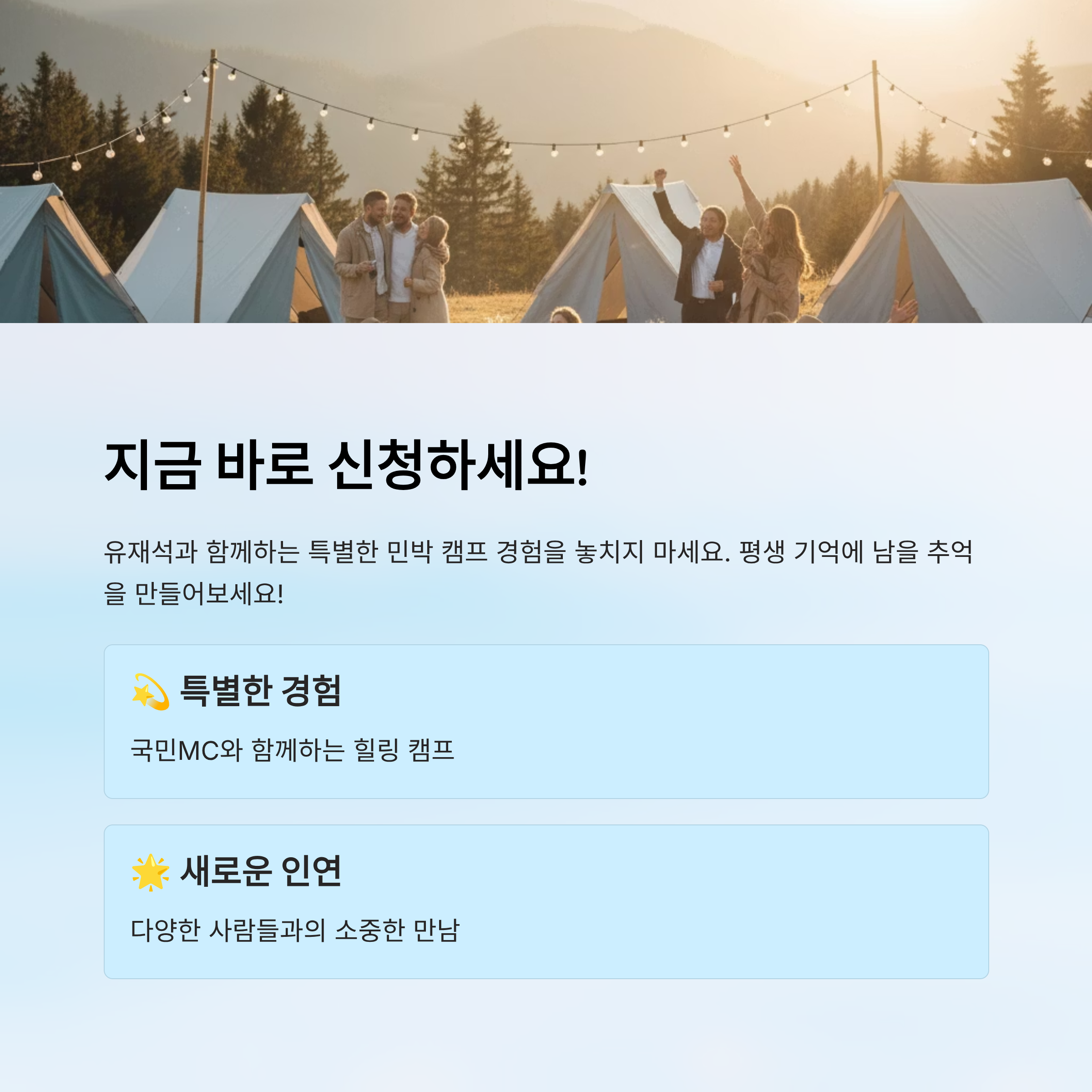 이번 프로그램은 단순한 숙박 예능이 아니라, 사람들과의 교류와 진솔한 이야기를 중심으로 꾸며질 예정이에요. 특히 국민MC 유재석이 직접 중심을 잡고, 다양한 출연진들이 함께 캠프를 꾸려나가는 방식이라 많은 기대를 모으고 있답니다.