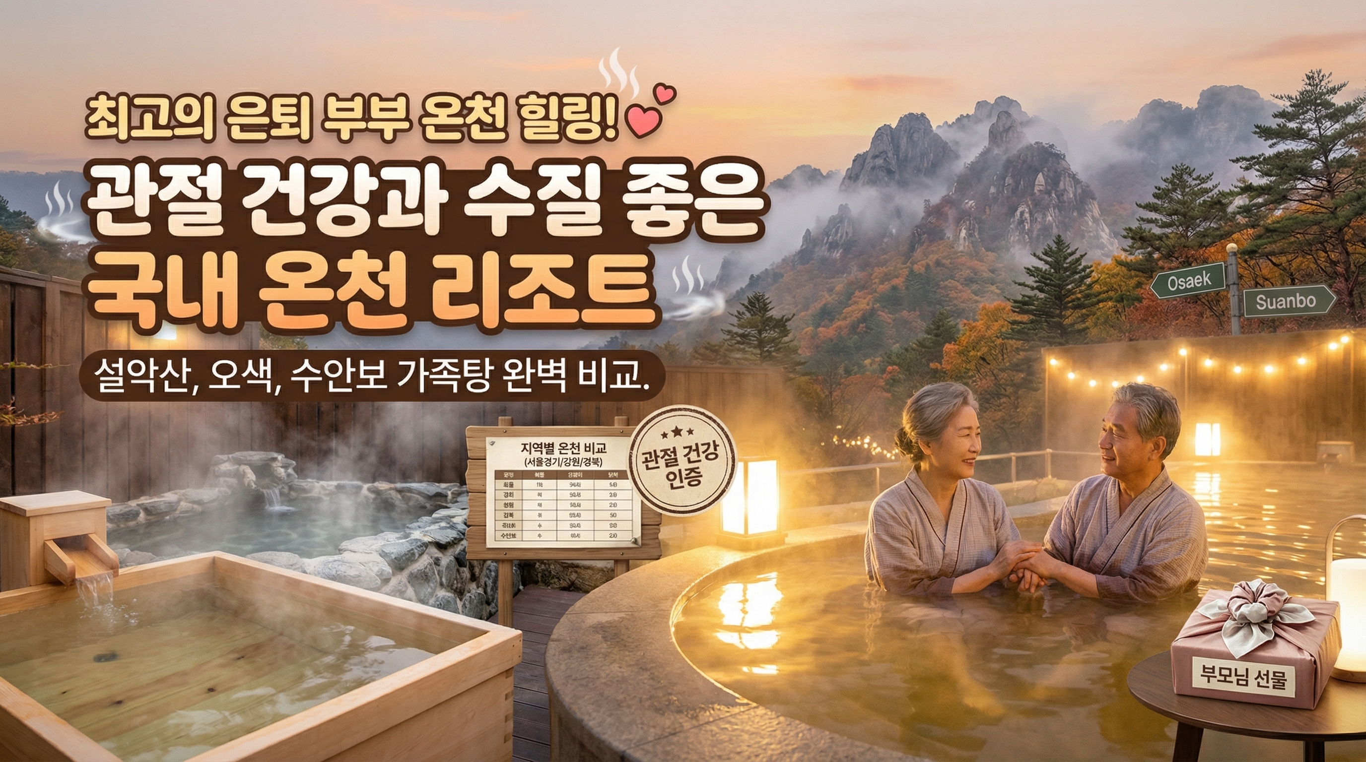 안녕하세요! 인생의 큰 산을 하나 넘으시고, 이제는 오롯이 서로에게 집중할 수 있는 귀한 시간을 맞이하신 은퇴 부부님들 반갑습니다. 😊 그동안 가족을 위해, 사회를 위해 쉼 없이 달려오느라 고생 많으셨습니다. 이제는 무거운 어깨의 짐을 잠시 내려놓고, 따뜻한 온천수에 몸을 담그며 지난날의 피로를 녹여낼 때입니다. 사실 저도 부모님 은퇴 기념 여행을 준비하면서 국내에 이렇게 수준 높은 온천 스파가 많은지 새삼 놀랐답니다. 단순히 목욕을 하는 곳이 아닌, 최고의 서비스와 자연경관이 어우러진 '리조트' 형태의 휴양지들을 엄선해 보았습니다. 이번 포스팅이 두 분의 앞날에 건강한 활력을 불어넣는 이정표가 되길 바랍니다.