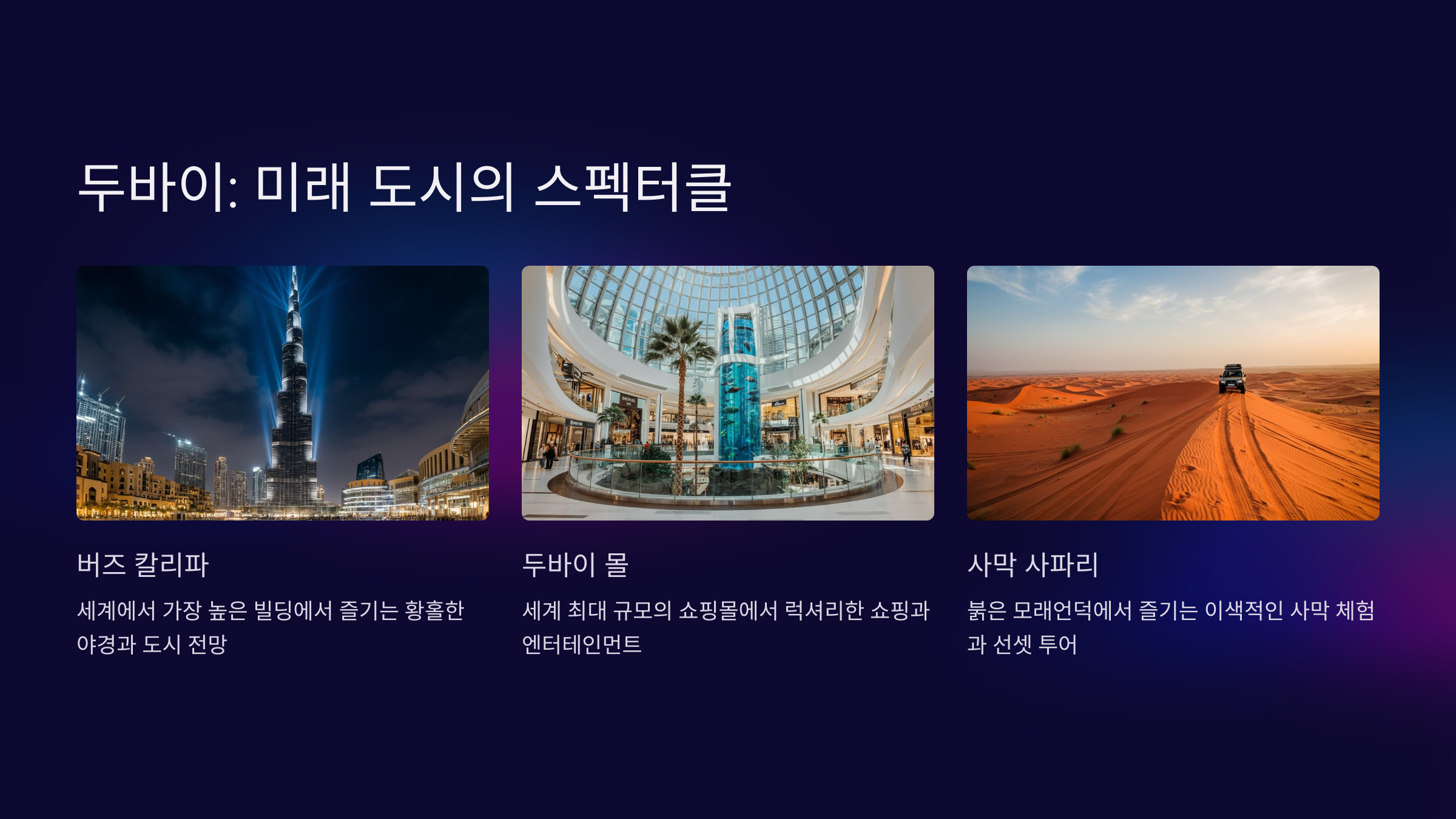 화려한 건축물과 사막이 공존하는 두바이는 독특한 분위기를 자랑합니다.