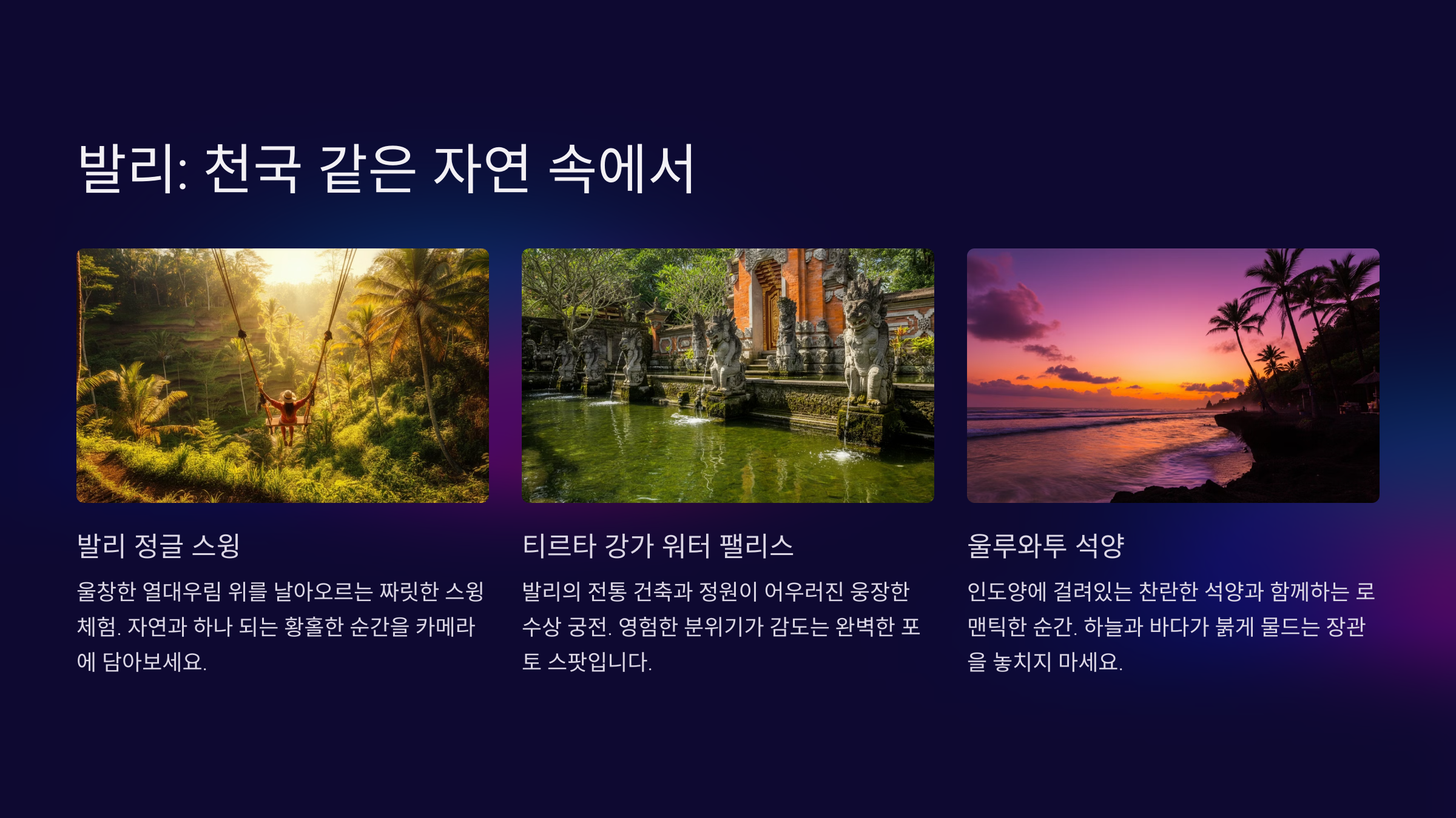 발리는 자연과 문화가 어우러져 이국적인 사진을 찍을 수 있는 곳입니다.