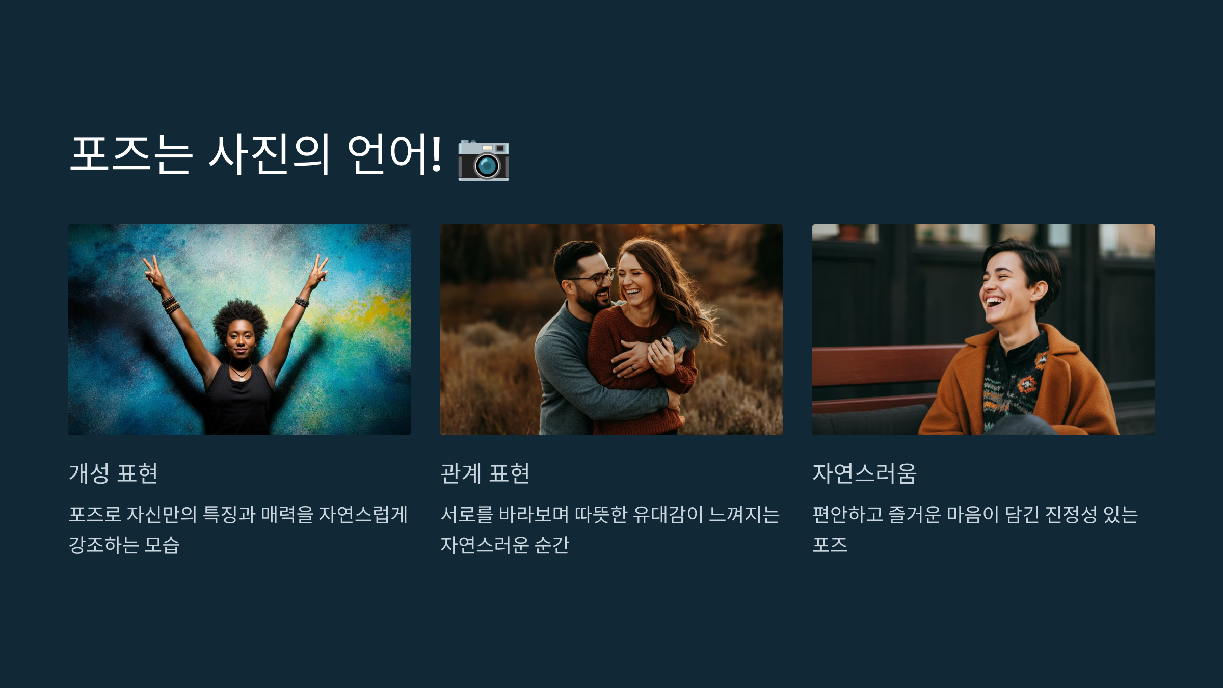 사진을 찍을 때 포즈는 결과물을 좌우하는 중요한 요소입니다. 자연스러운 포즈, 관계를 보여주는 포즈, 개성을 드러내는 포즈 등 상황에 맞게 연출하면 더 멋진 사진을 남길 수 있죠! 오늘은 커플, 가족, 그리고 솔로 여행자를 위한 포즈 가이드를 소개합니다. 이 글을 읽고 나면 "내 사진 어색해!"라는 고민은 더 이상 없을 거예요. 😊