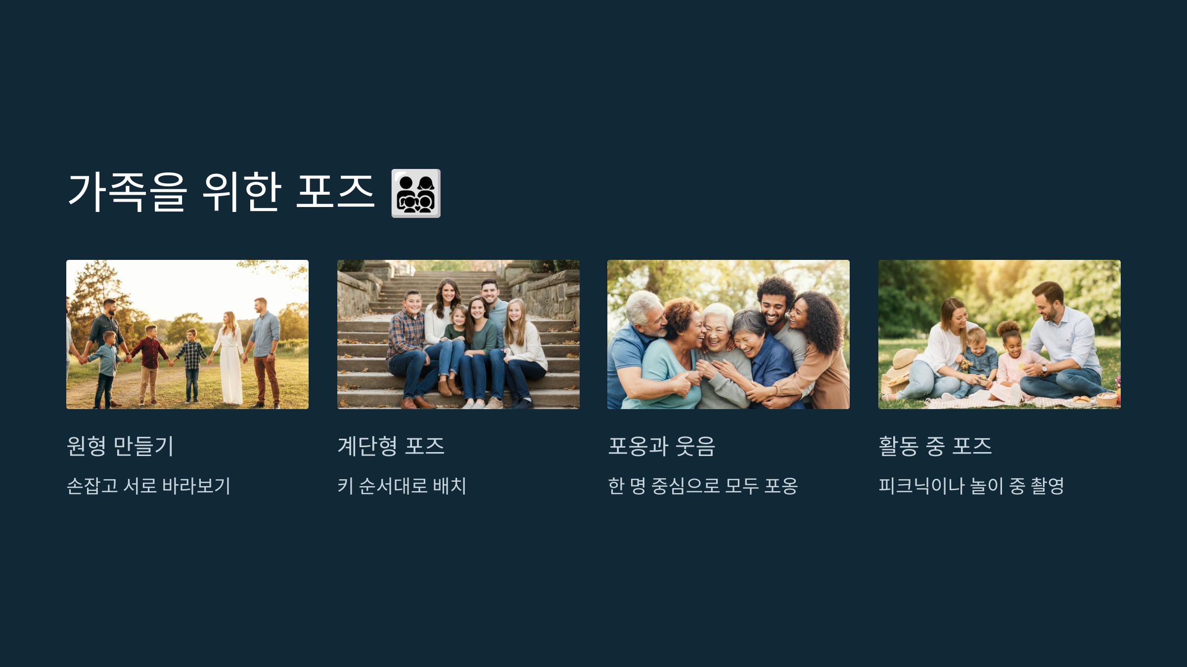 가족 사진은 따뜻한 유대감을 보여주는 것이 중요합니다. 모두가 자연스럽게 어우러지는 포즈를 시도해 보세요.