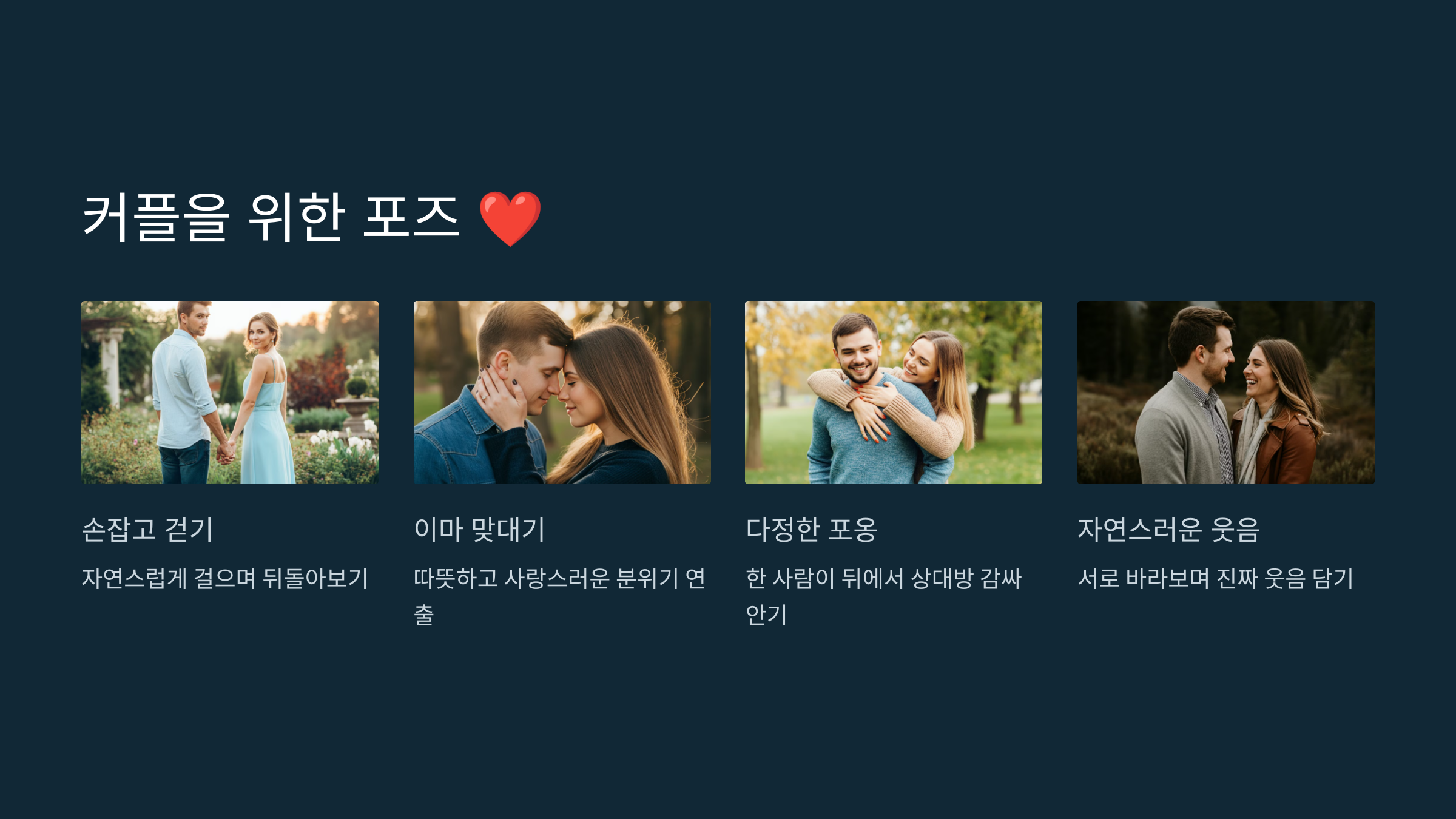 커플 사진은 사랑과 애정을 보여주는 것이 포인트! 자연스럽고 감성적인 포즈로 아름다운 순간을 남겨보세요.