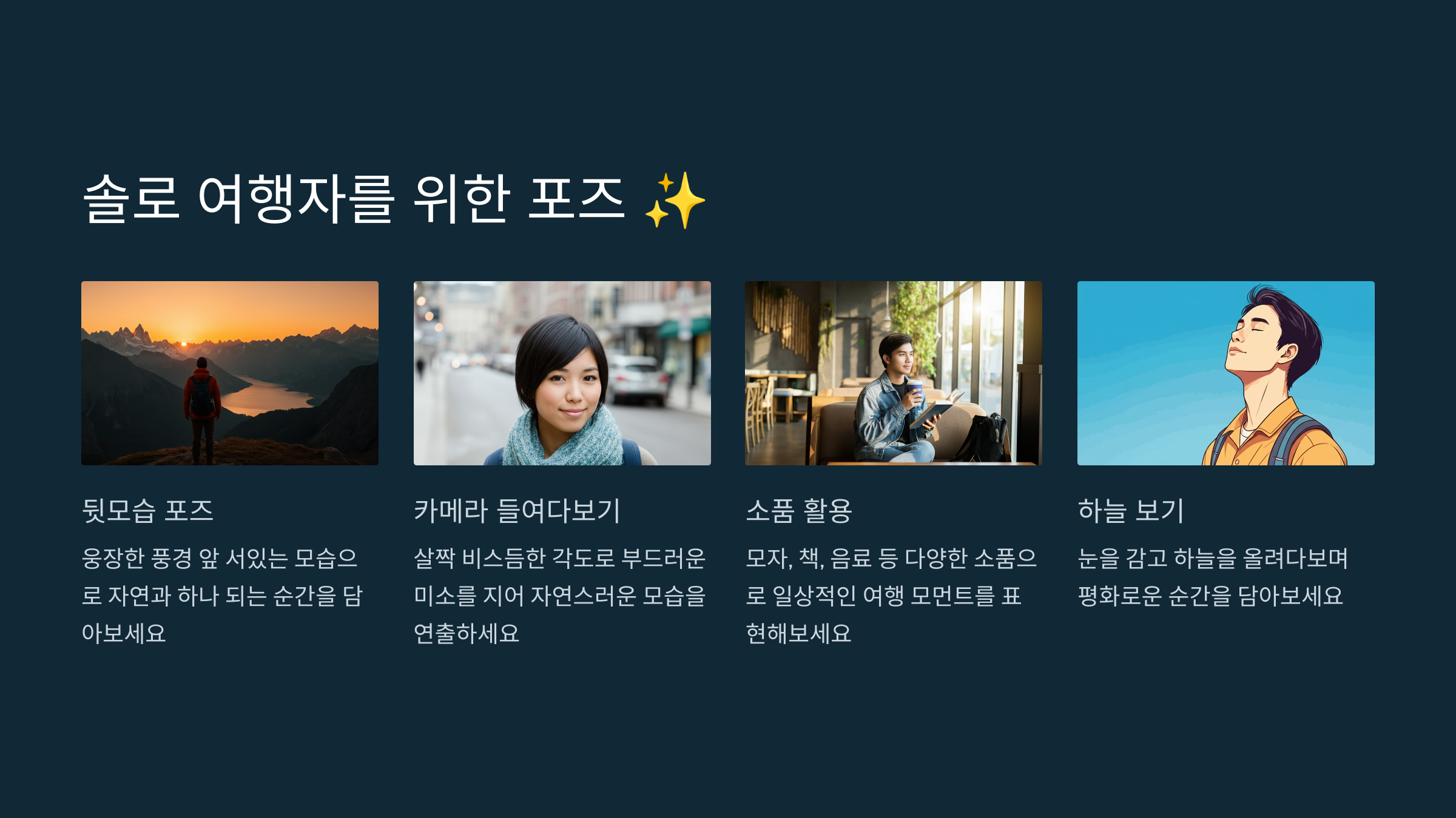 사진 속 포즈는 단순한 동작 그 이상입니다. 각자의 개성과 관계를 표현하는 언어이기도 하죠. 오늘 소개한 커플, 가족, 솔로 여행자를 위한 포즈를 참고해 여러분만의 멋진 순간을 담아보세요! 중요한 건 자연스럽고 즐거운 마음으로 임하는 겁니다. 😊