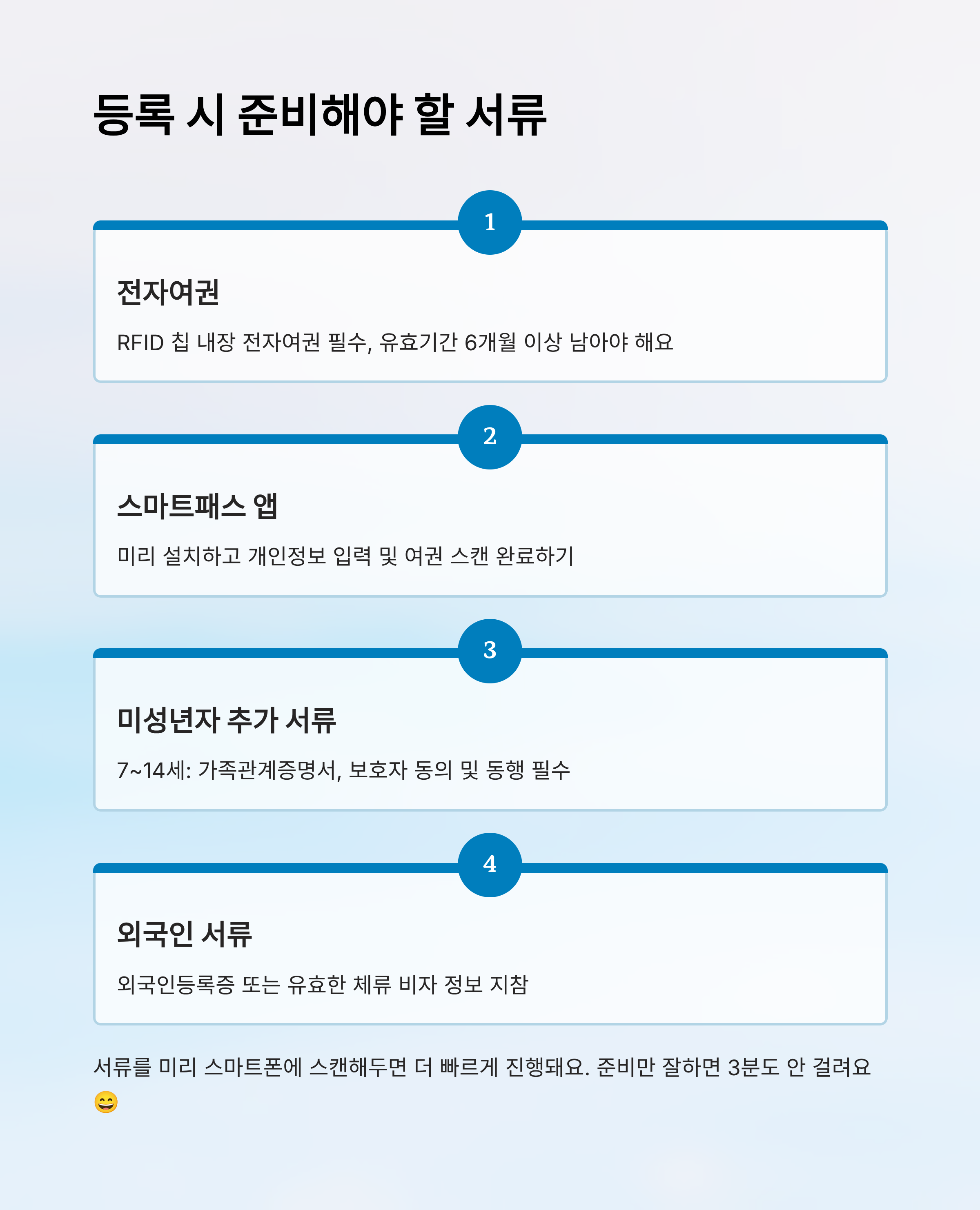 두 번째로 자주 발생하는 문제는 미성년자 등록 요건 미충족이에요. 만 7세 이상 14세 미만은 반드시 보호자와 동행해야 하고, 보호자의 스마트패스 ID로 등록해야 해요. 가족관계증명서가 없거나 보호자의 동의가 없다면 등록이 거절될 수 있어요.