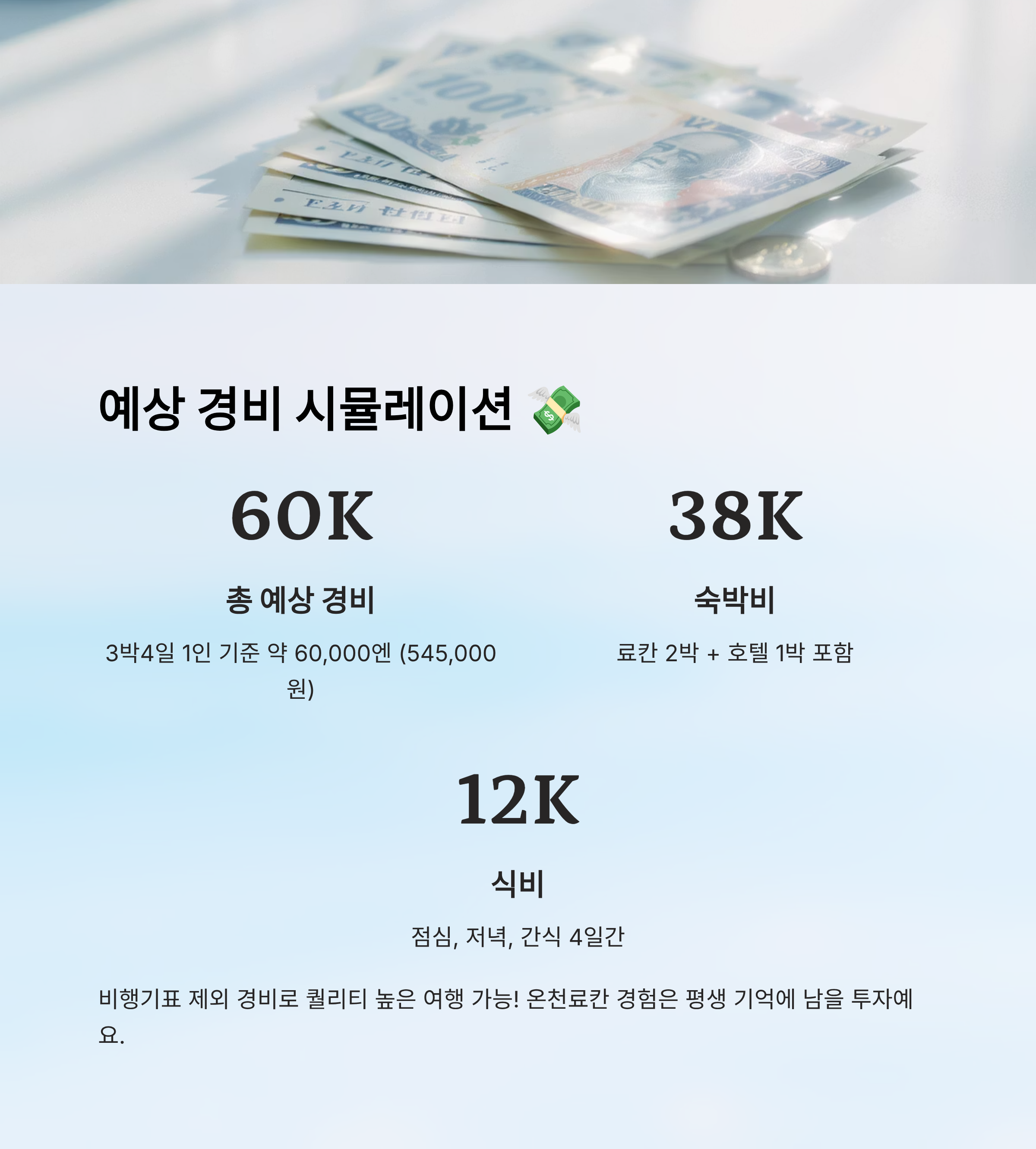 비행기표를 제외한 경비가 약 55~60만 원이면 꽤 퀄리티 있는 여행을 할 수 있어요. 특히 온천료칸에서 하루라도 묵는다면 그 추억은 오래 가니까, 살짝만 투자해보는 것도 좋아요. 😊