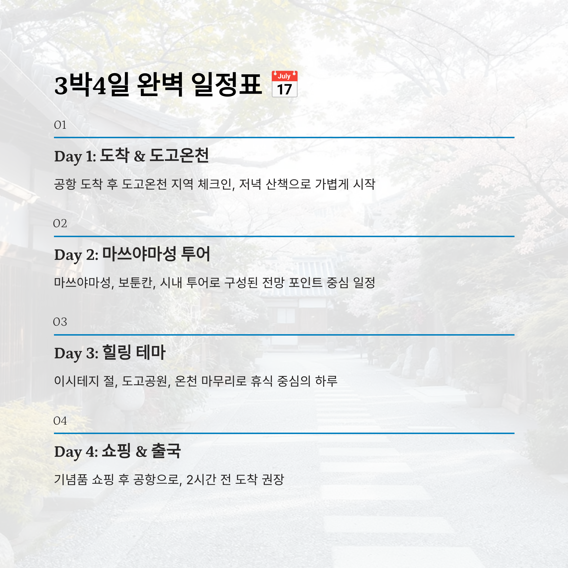 | Day 3 | 이시테지 → 도고공원 → 온천 마무리 | 버스 / 도보 | 휴식 중심 |