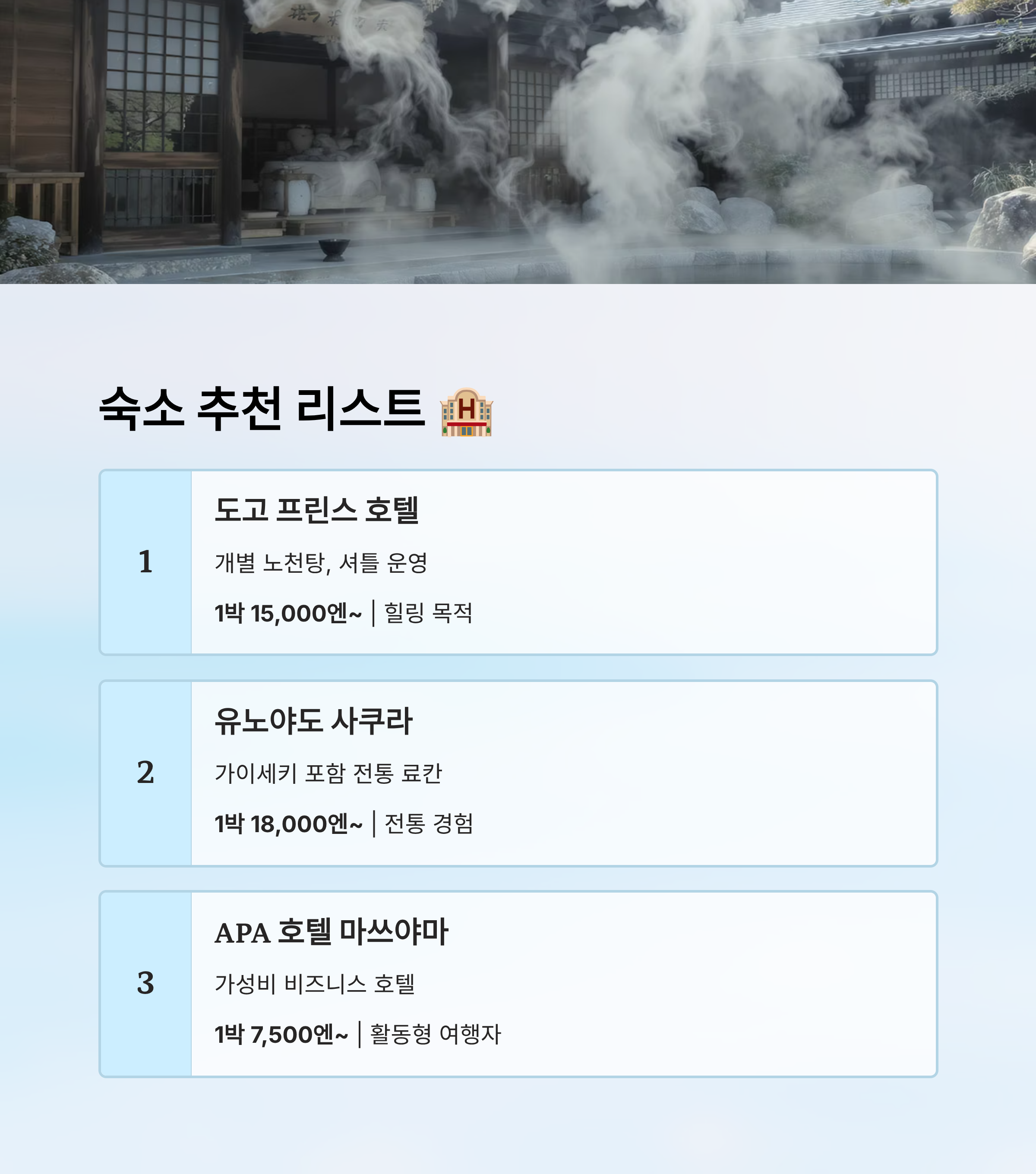 숙소 선택은 여행의 만족도를 결정짓는 중요한 요소예요. ‘매일 온천이 기다리는 숙소’가 있다는 건 생각보다 큰 행복이니까요! 🛁