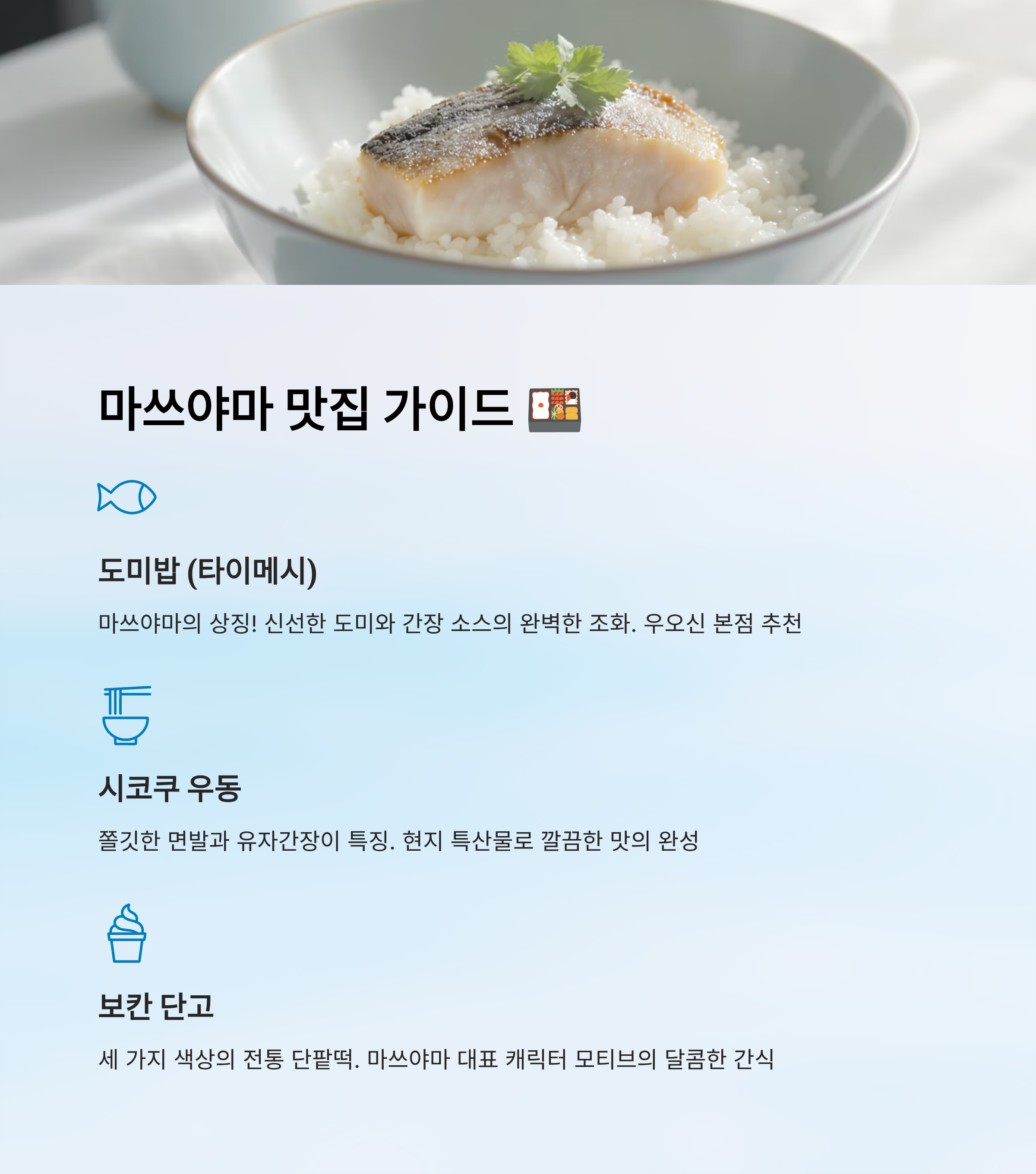 마쓰야마의 음식은 하나같이 정성이 들어가 있고, 과하지 않아 부담 없이 즐길 수 있어요. 식도락 여행자라면 이 도시, 절대 놓치지 마세요! 🍜