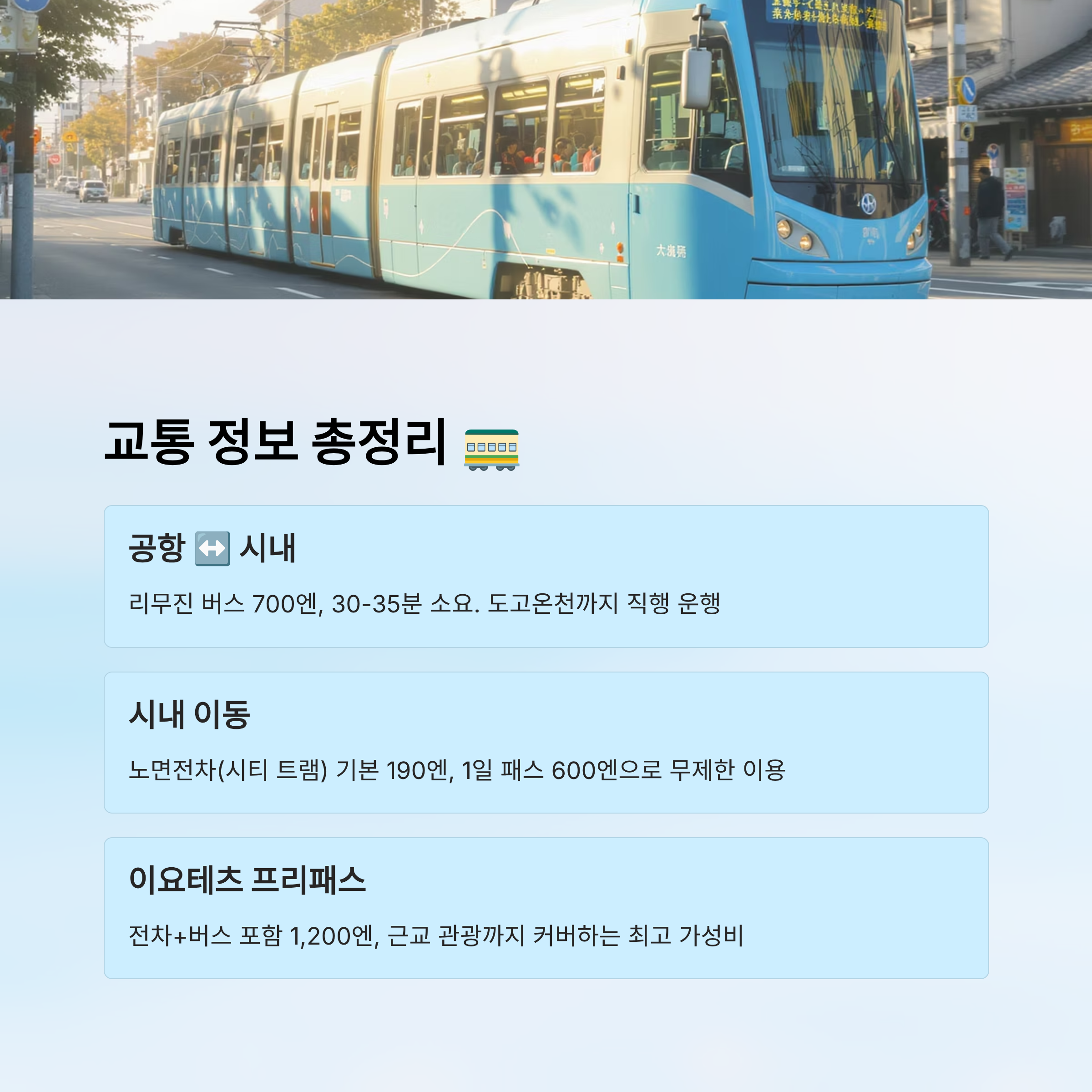 | 이요테츠 프리패스 | 노면전차 + 버스 | 1,200엔 | 관광안내소, 호텔 | 근교 포함 여행 시 |