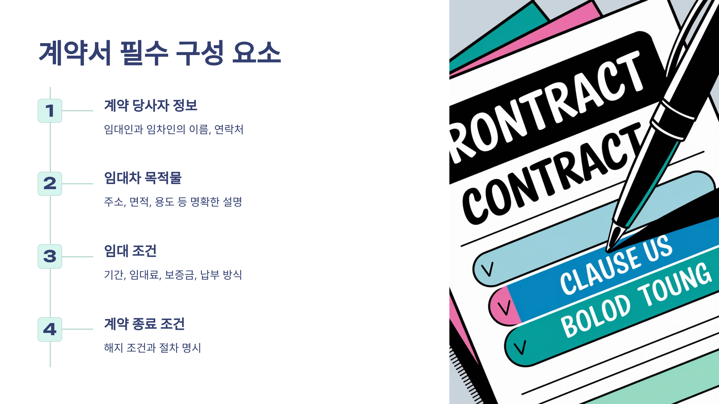 임대차 계약을 체결할 때에는 반드시 포함되어야 하는 요소들이 있어요. 계약서에 이 항목들이 빠지지 않았는지 꼼꼼히 확인해 봐야 해요. 첫 번째로, 임대인의 이름과 임차인의 이름, 즉 계약 당사자 정보가 명확히 기재되어 있어야 해요. 계약 당사자는 실제 소유권을 가진 사람이어야 한다는 점도 중요해요.