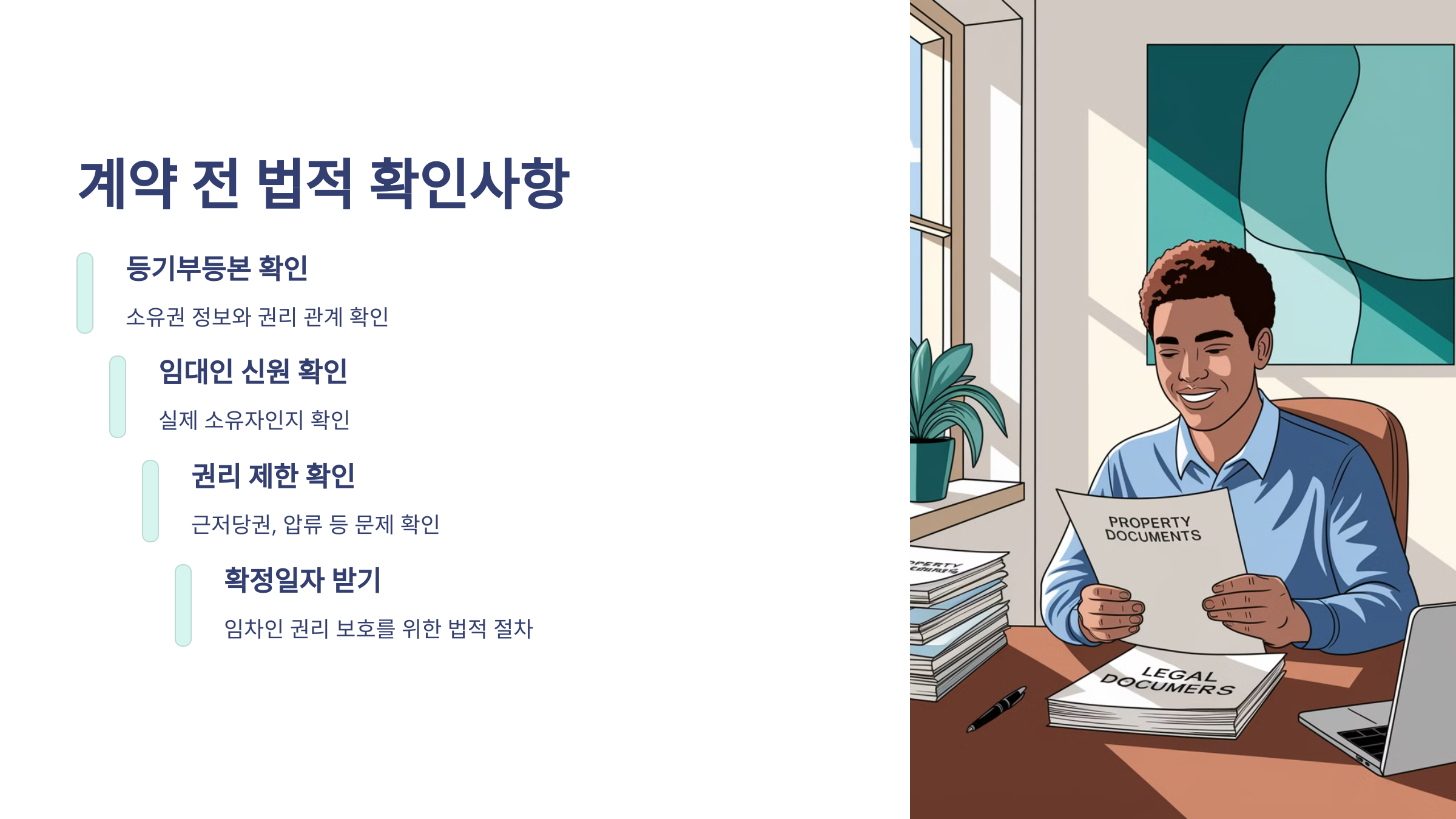 계약을 체결하기 전에, 법적으로 확인해야 할 몇 가지 중요한 사항들이 있어요. 가장 먼저 해야 할 일은 부동산 등기부등본을 발급받아 확인하는 거예요. 등기부등본에는 해당 부동산의 소유권 정보와 권리 관계가 상세히 기록되어 있어요.