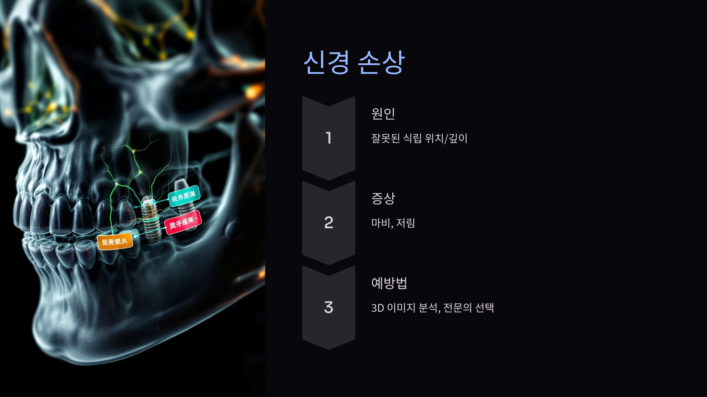 시술 중 신경에 가까운 부위에 임플란트를 심으면 신경이 손상될 위험이 있습니다.