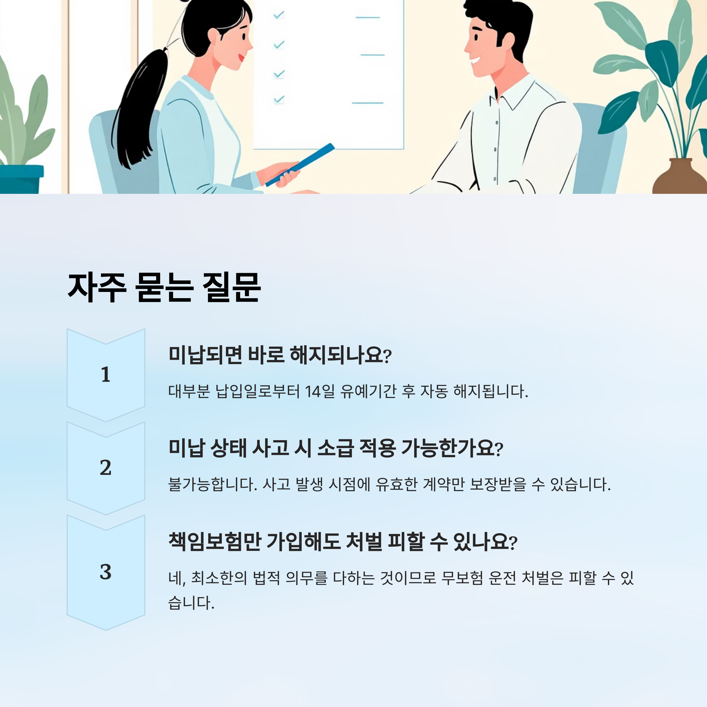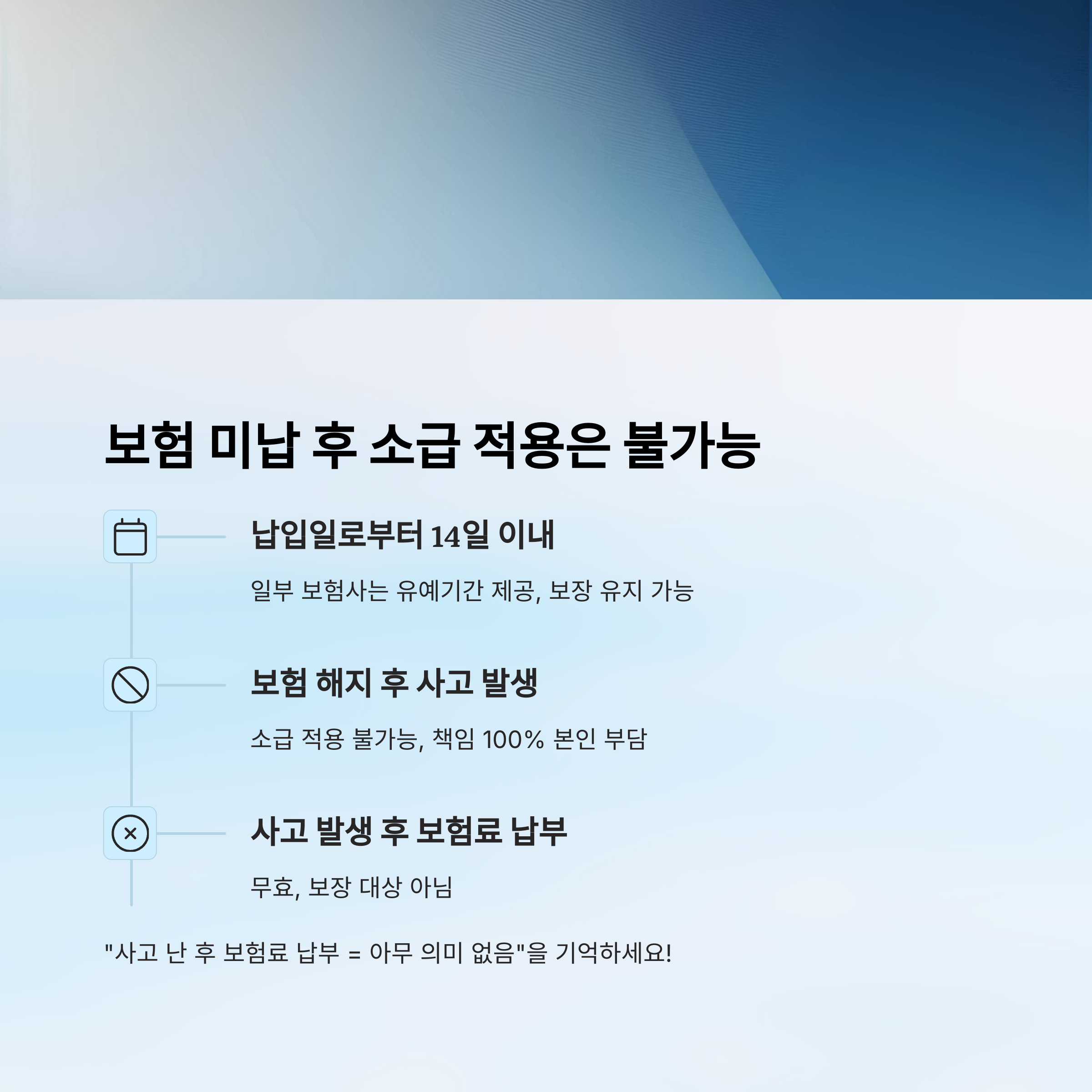 보험은 '미래의 사고'에 대한 대비이지, 이미 일어난 일에 대한 해결책이 아니에요. 무조건 선납, 선보장 원칙을 기억하고 있어야 해요. 깜빡한 하루가 수천만 원의 빚으로 돌아올 수 있으니, 보험료는 반드시 제때 납부하는 습관을 들이자구요! 🚨