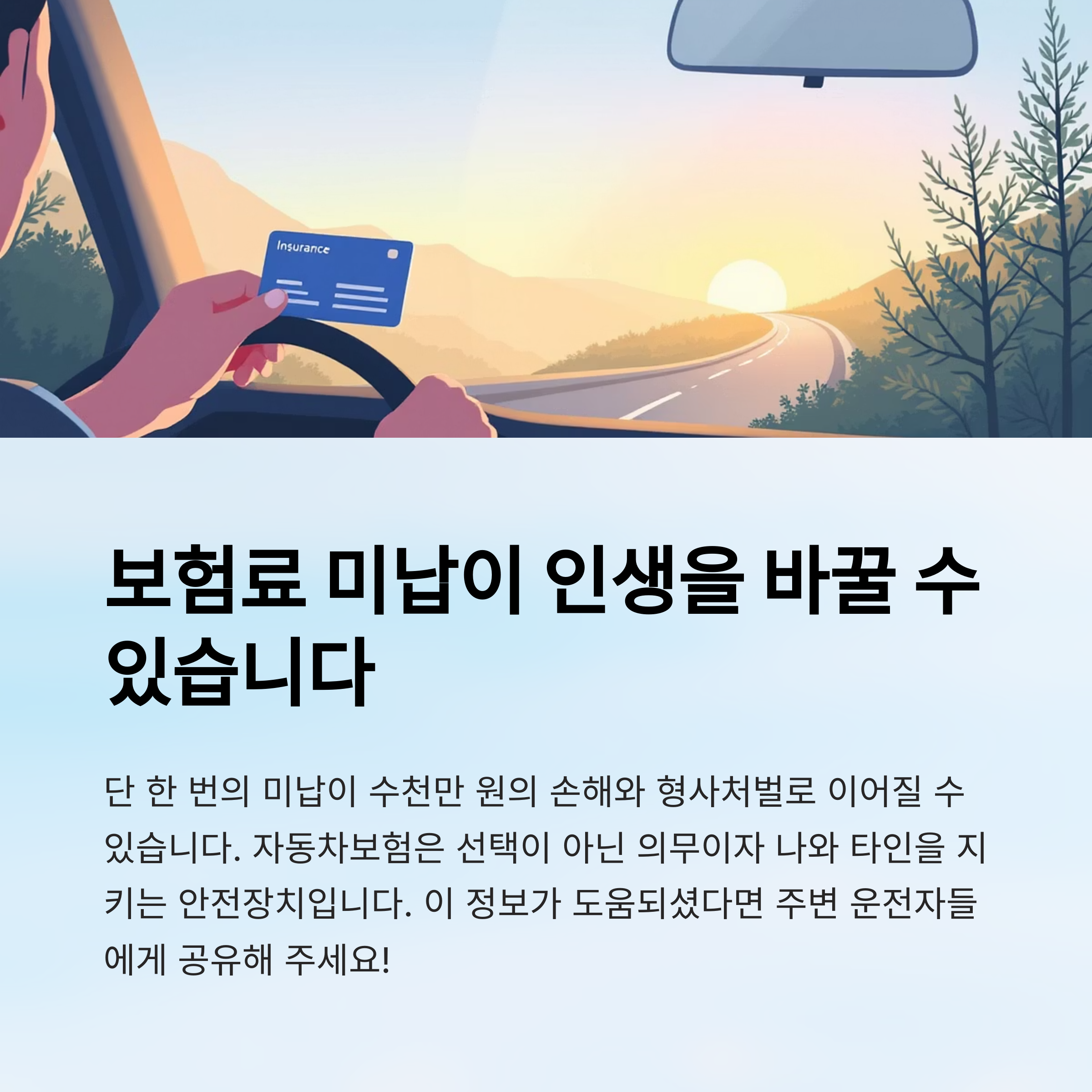 자동차보험은 단순히 돈을 내고 혜택을 받는 거래가 아니에요. 나와 타인의 안전을 위해 반드시 지켜야 할 약속이에요. 무심코 넘겼던 한 달 보험료가 나중엔 수천만 원의 손해로 돌아올 수 있다는 걸 기억하세요! 💥