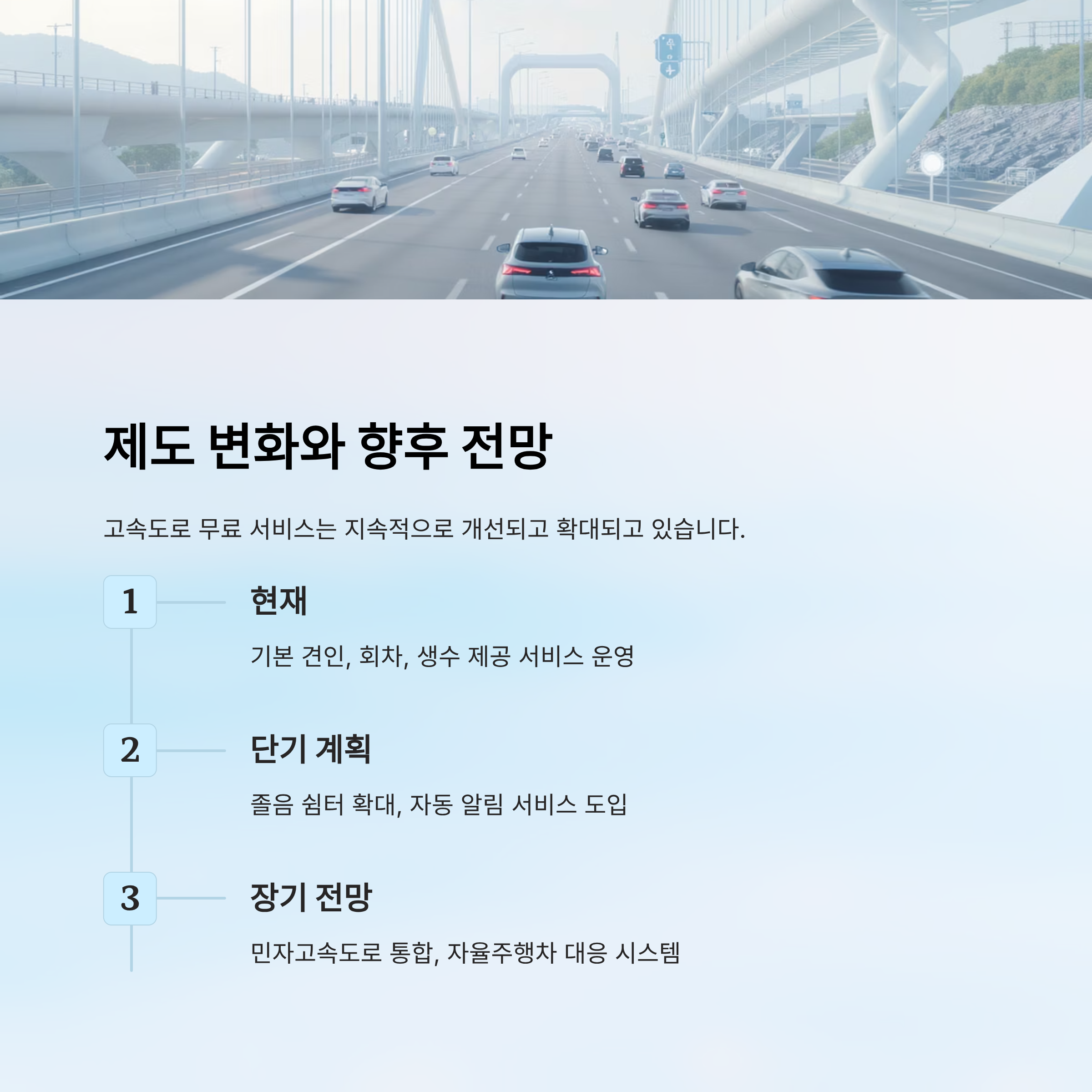 현재 국토교통부에서도 예산을 증액하며, 고속도로 이용자 편의 확대를 위해 다양한 시범사업을 운영 중이에요. 안전하고 편리한 고속도로를 위한 노력은 앞으로도 계속될 거예요. 🛣