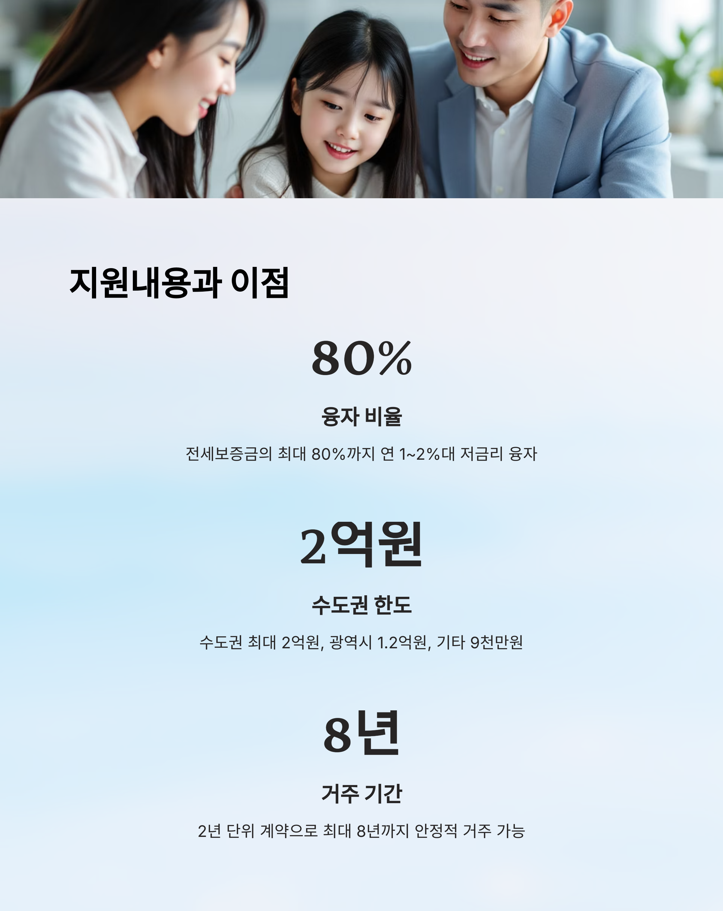 먼저, 정부는 전세보증금의 최대 80%까지를 연 1~2%대의 낮은 이자로 융자해줘요. 예를 들어 수도권에선 최대 2억 원까지 지원받을 수 있고, 광역시는 1억 2천만 원, 그 외 지역은 9천만 원 한도예요. 이자부담이 적다 보니 초기 자금 마련이 어려운 분들에게 특히 유리하죠. 💸