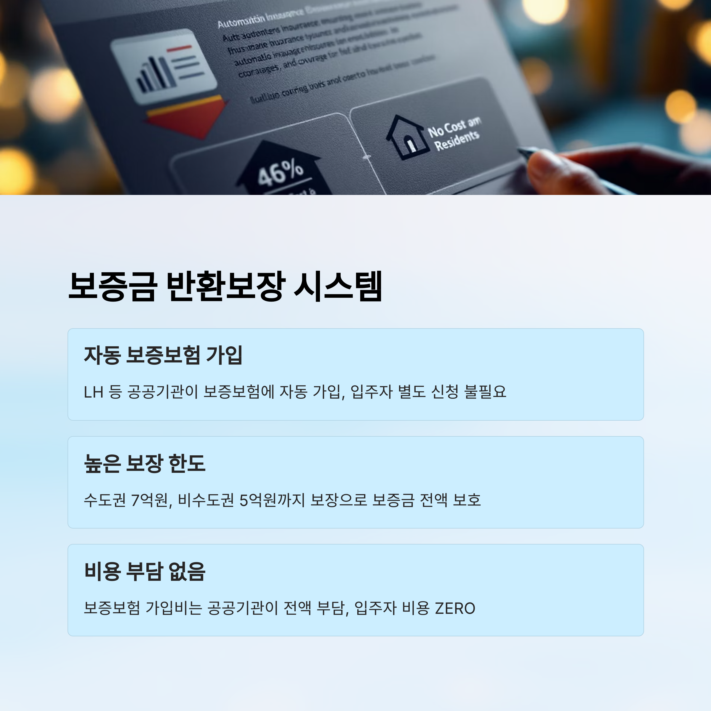 이 제도의 좋은 점은, 세입자가 따로 돈을 내지 않아도 된다는 거예요. 보증보험 가입비는 LH 같은 공공기관이 모두 부담하고, 입주자는 서류만 잘 준비하면 된답니다. 비용 부담 ZERO, 리스크도 ZERO! 🎉