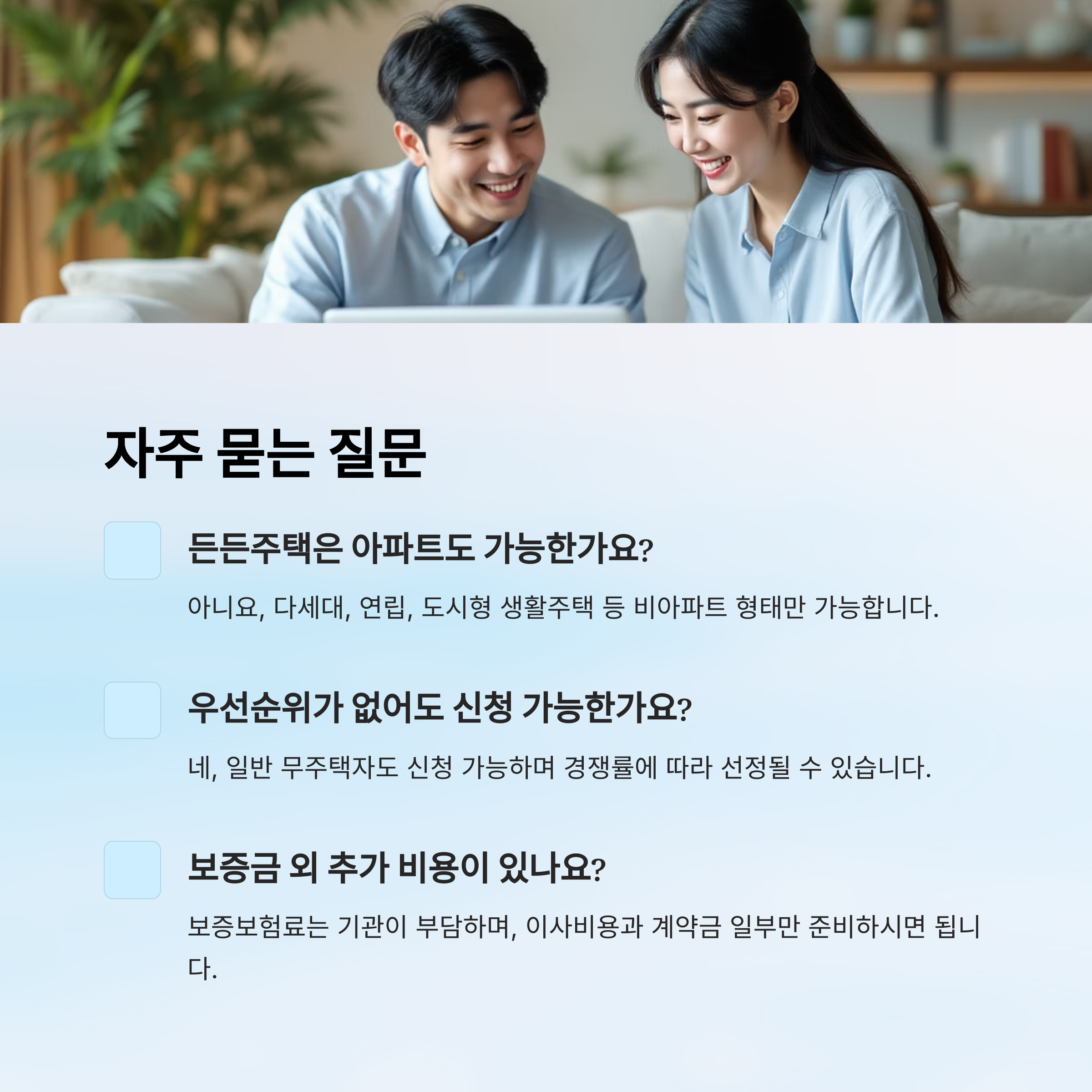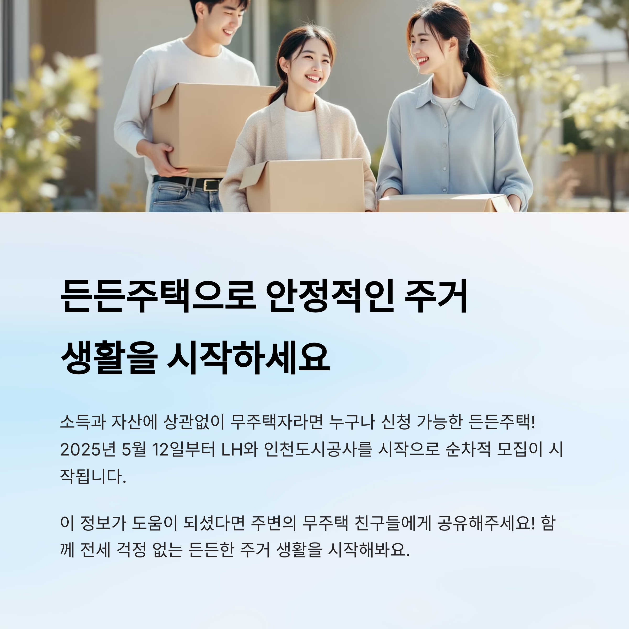 정리하자면, 든든주택은 ‘낮은 이자’, ‘안전한 계약’, ‘장기 거주’, ‘신청 간편’이라는 네 박자를 모두 갖춘 제도예요. 이름처럼 든든하게 살 수 있는 조건을 갖춘 제도죠.