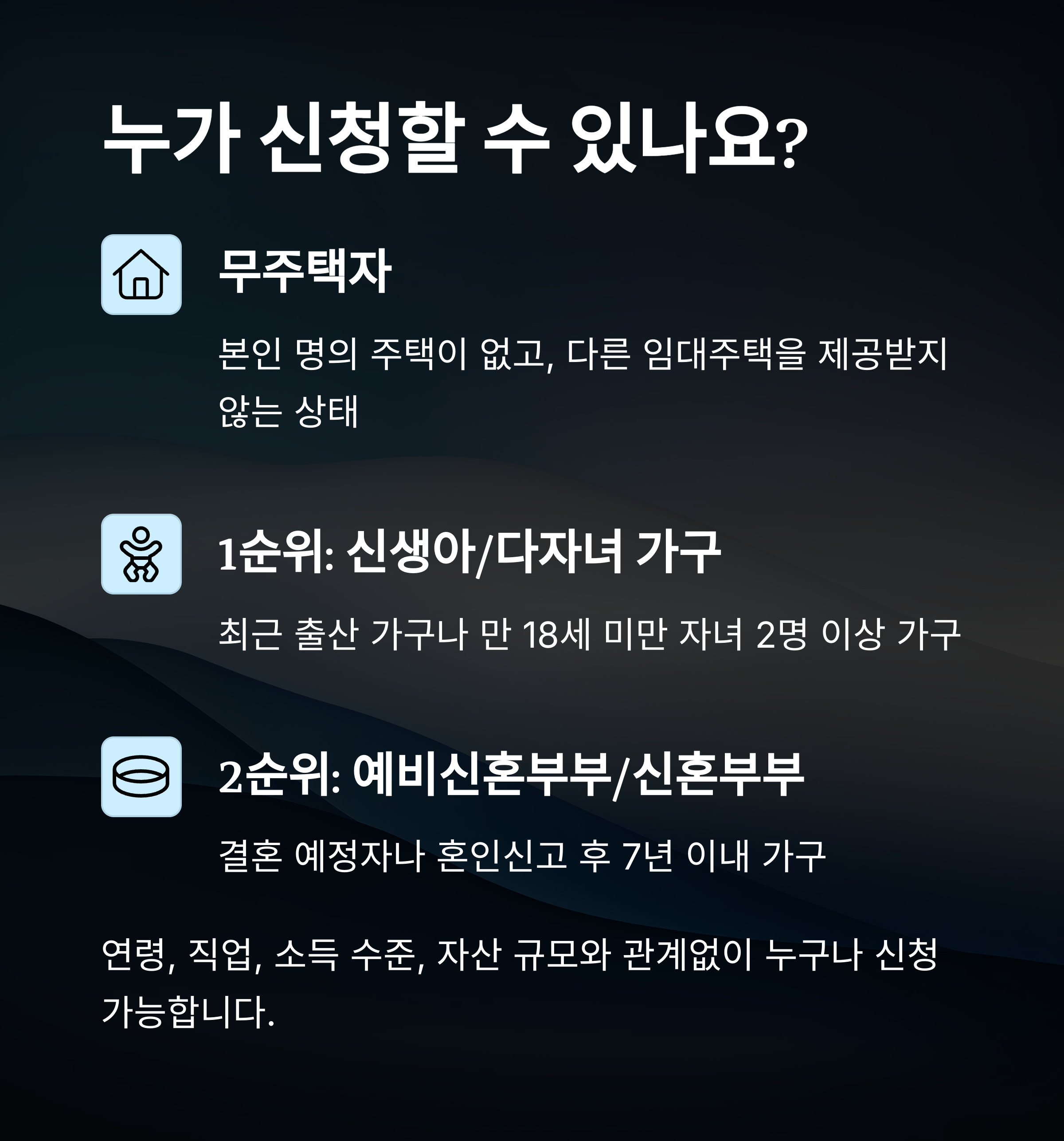 즉, 현재 본인 명의로 소유하고 있는 주택이 없고, 다른 임대주택을 제공받고 있지 않은 상태라면 누구나 신청할 수 있어요. 연령, 직업, 소득 수준, 자산 규모 같은 기준이 없기 때문에 더 많은 사람들이 지원 가능하답니다.