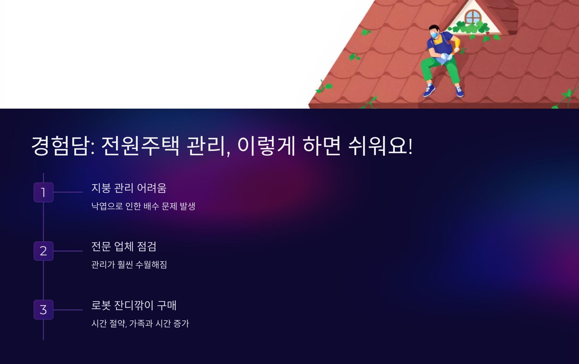 몇 해 전, 강원도에 전원주택을 짓고 입주한 후 가장 힘들었던 것은 지붕 관리였습니다. 낙엽이 지붕 배수구를 막아 비 오는 날마다 물이 고였죠. 😅