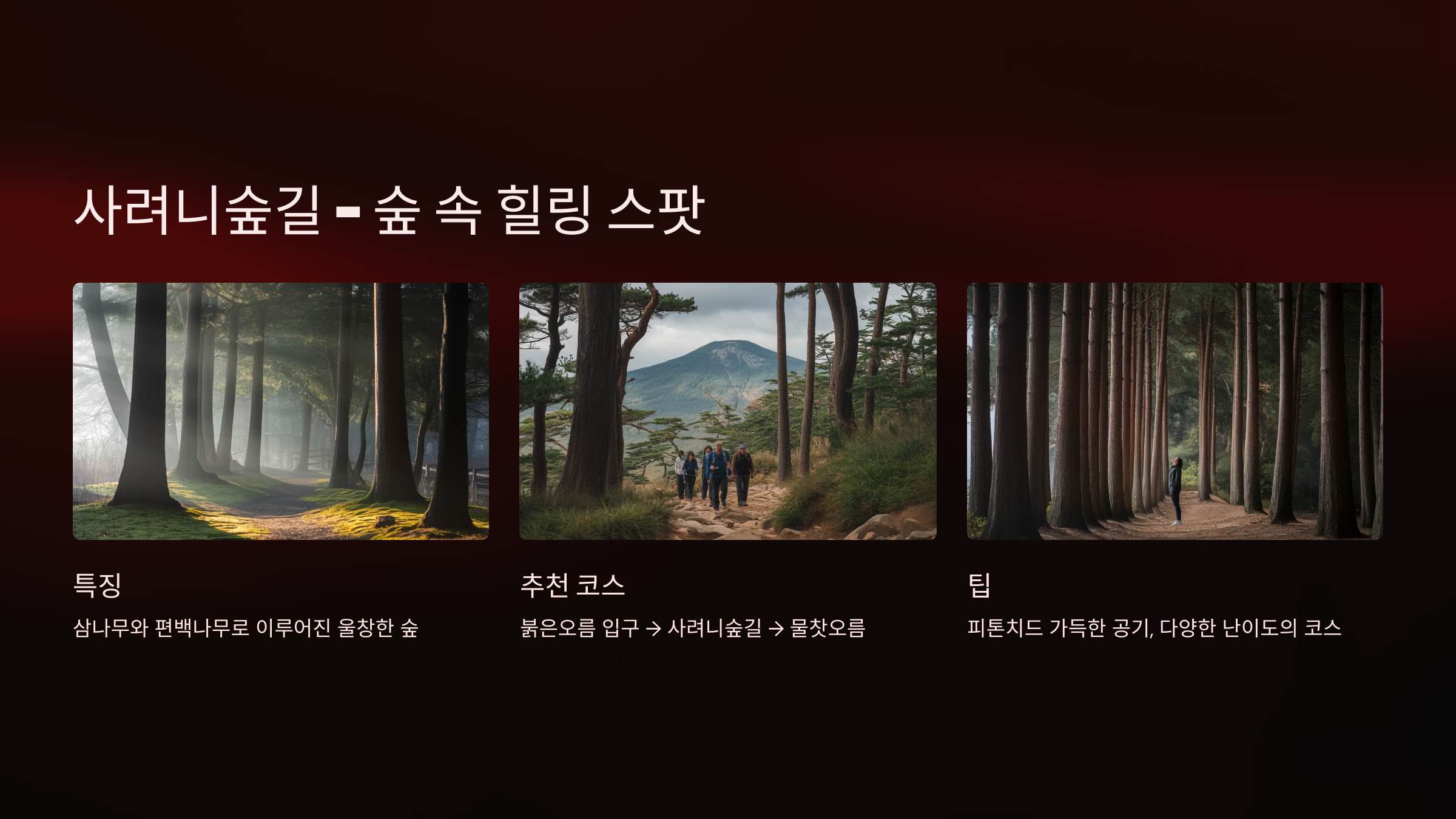 - 추천 코스: 붉은오름 입구 → 사려니숲길 → 물찻오름