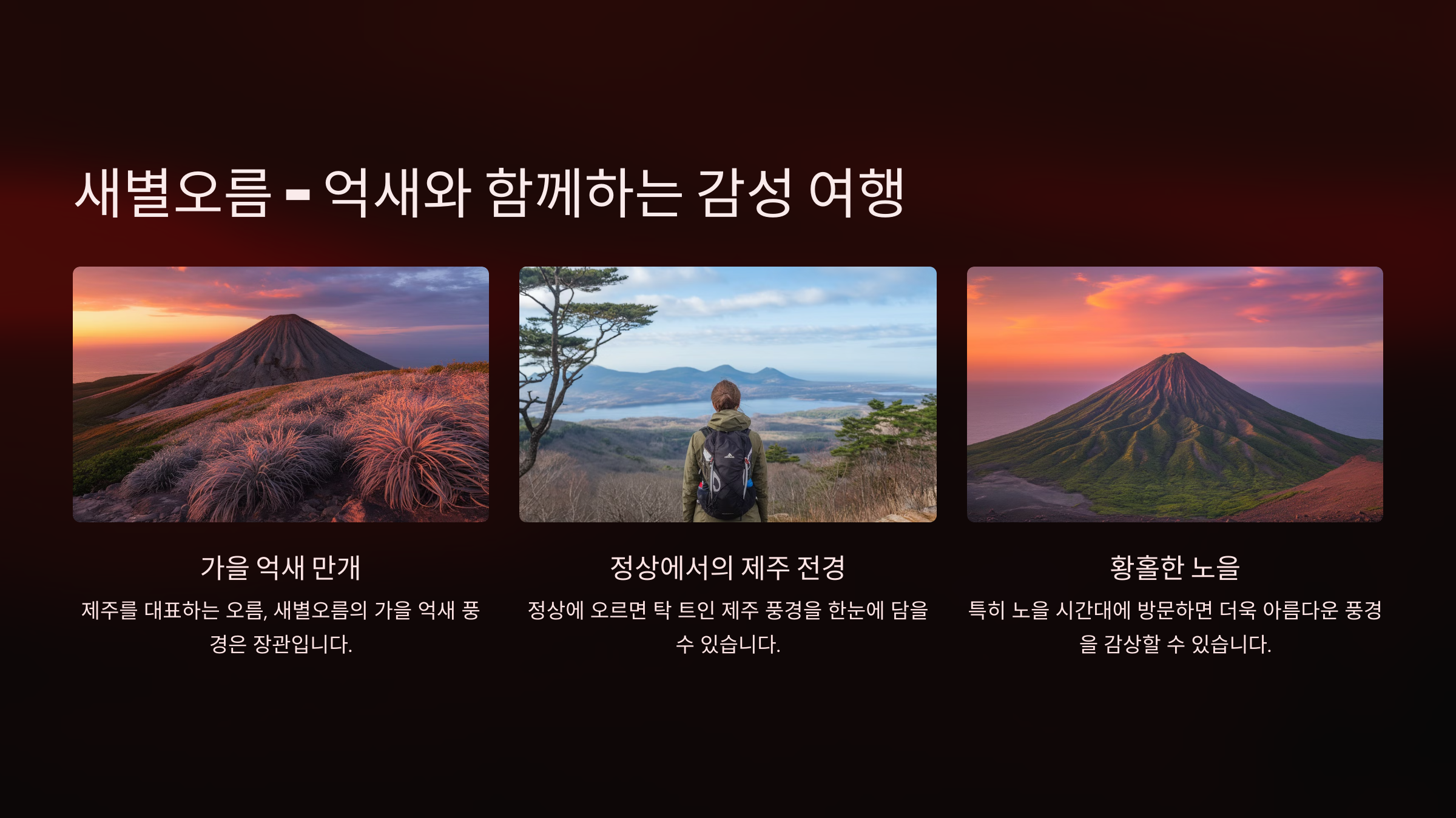 - 특징: 새별오름은 가을이 되면 억새가 만개하며, 제주를 대표하는 오름 중 하나입니다. 오름 정상에 오르면 제주 전경이 한눈에 들어옵니다.