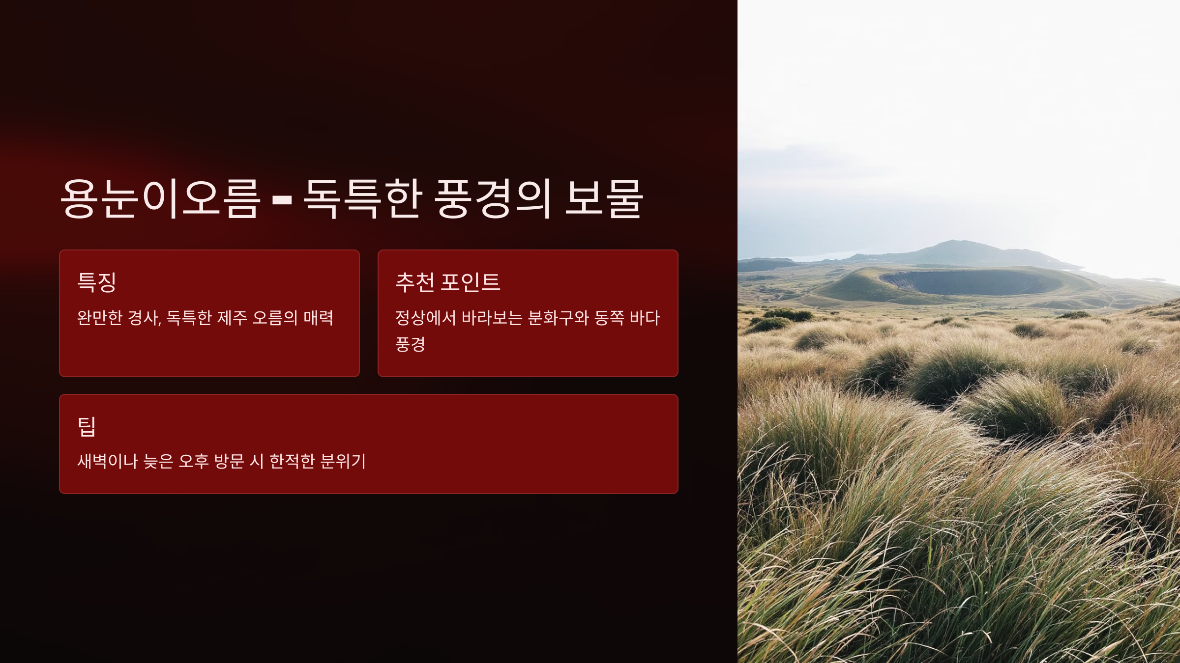 - 특징: 제주 동쪽에 위치한 용눈이오름은 비교적 완만한 경사로, 가볍게 오르며 독특한 제주 오름의 매력을 느낄 수 있습니다. 넓게 펼쳐진 초원이 바람에 흔들리는 모습은 감동적입니다.