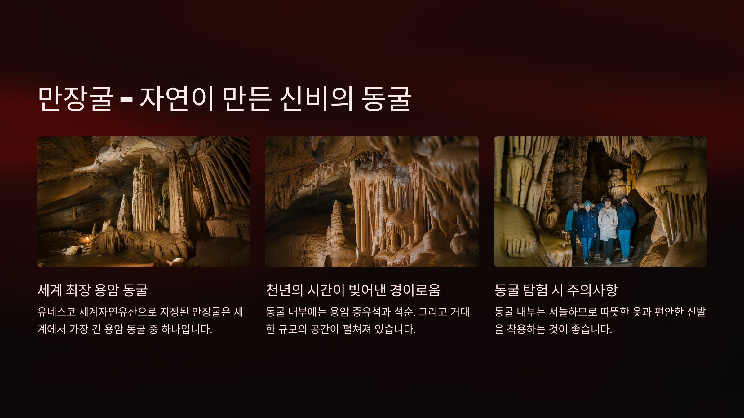 - 팁: 동굴 내부는 온도가 낮고 어두우니 따뜻한 옷과 편안한 신발을 착용하세요.