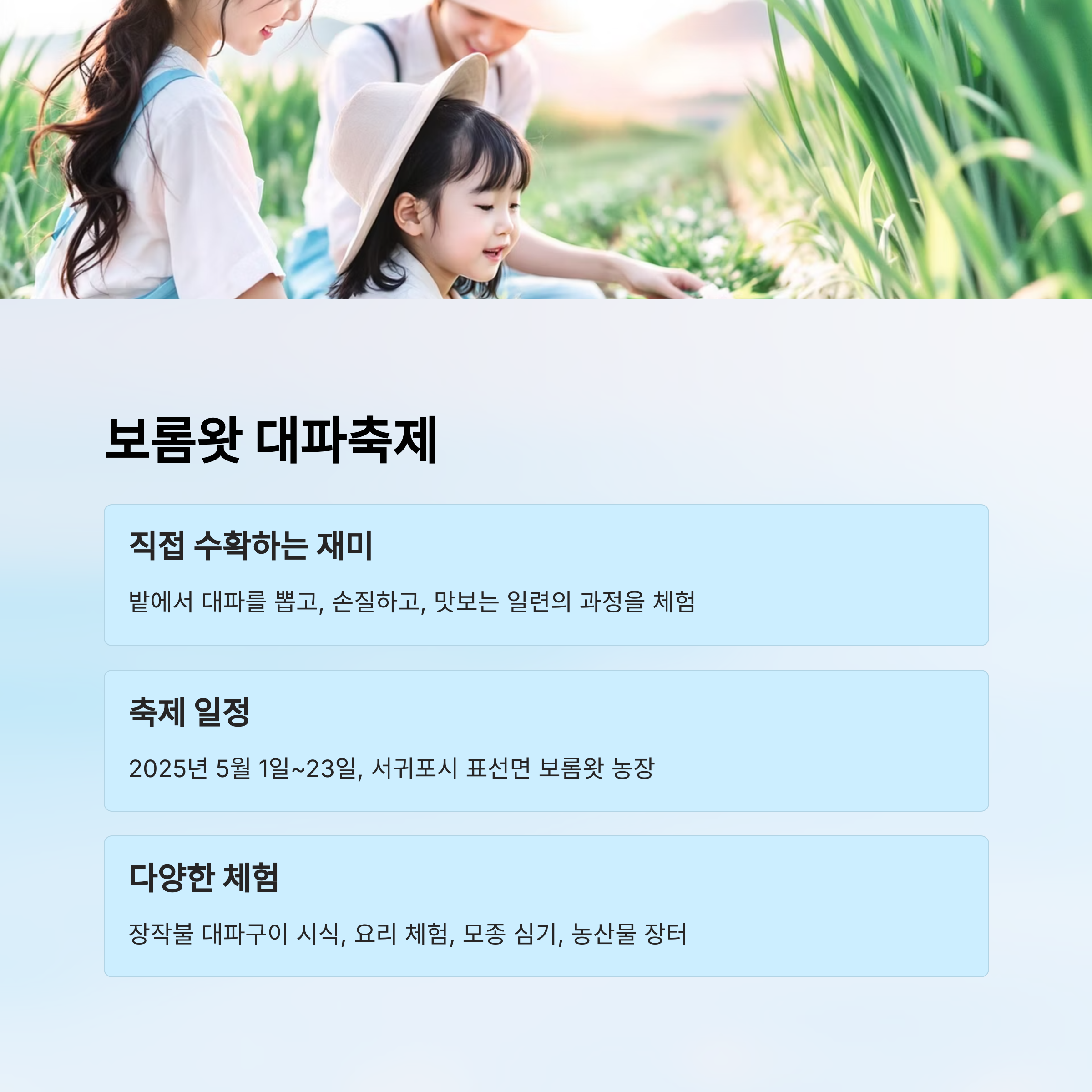| 보롬왓 대파축제 | 5/1 ~ 5/23 | 대파 수확, 요리 체험 | 파밭 포토존, 농산물 장터 |